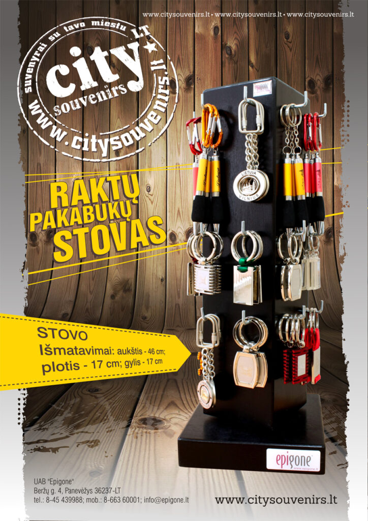 Sukamas raktų pakabukų stovelis. Stovai pagaminti iš medžio yra keletos atspalvių: juodi; šviesūs lakuoti, beicuoti rusvu atspalviu.