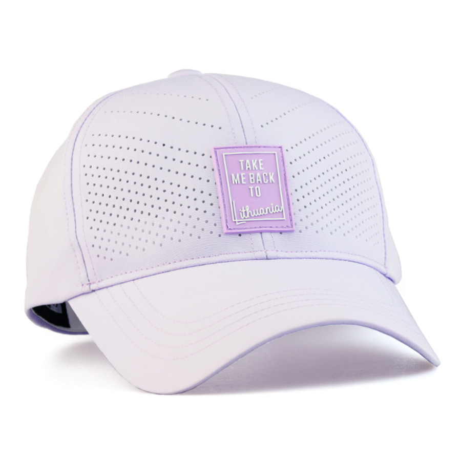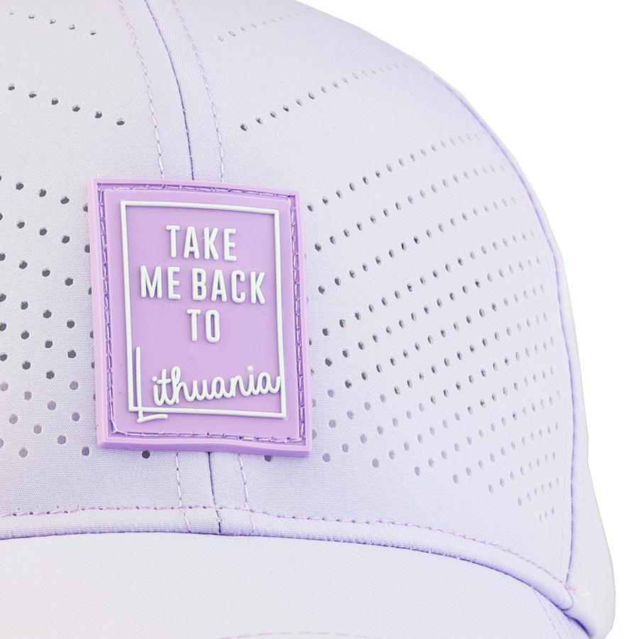 Stilinga alyvinės spalvos kepurė su užrašu „Take Me Back To Lithuania“ – modernus ir jaunatviškas lietuviškas suvenyras keliautojams.