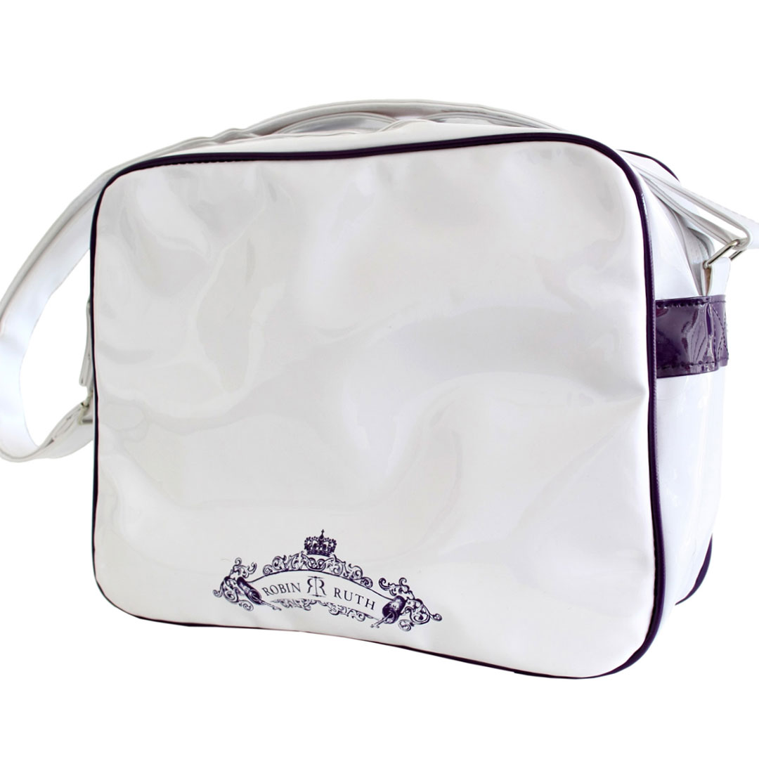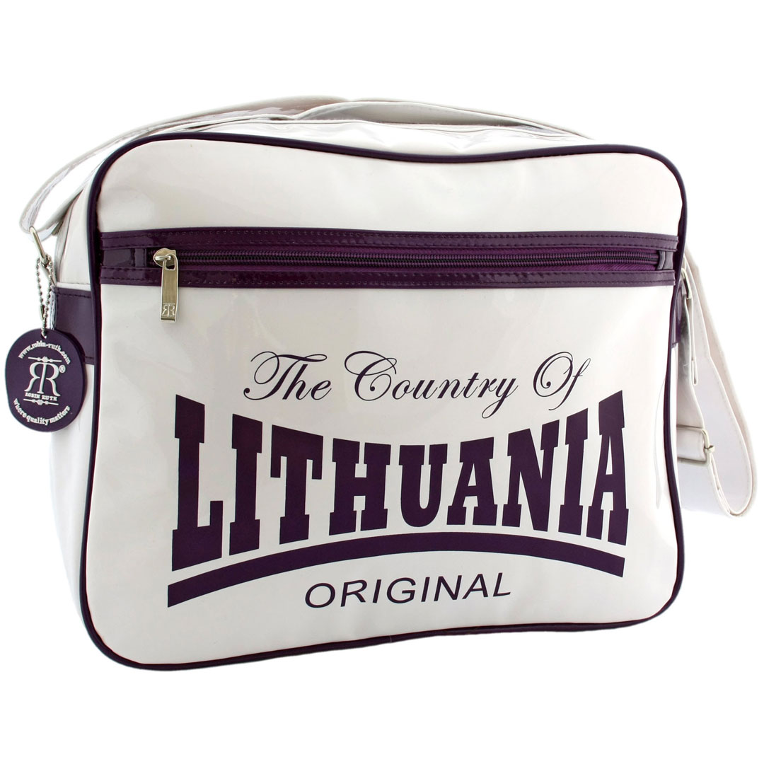 Balta blizgi rankinė su „Lithuania“ dizainu – stilingas ir praktiškas aksesuaras kelionėms.