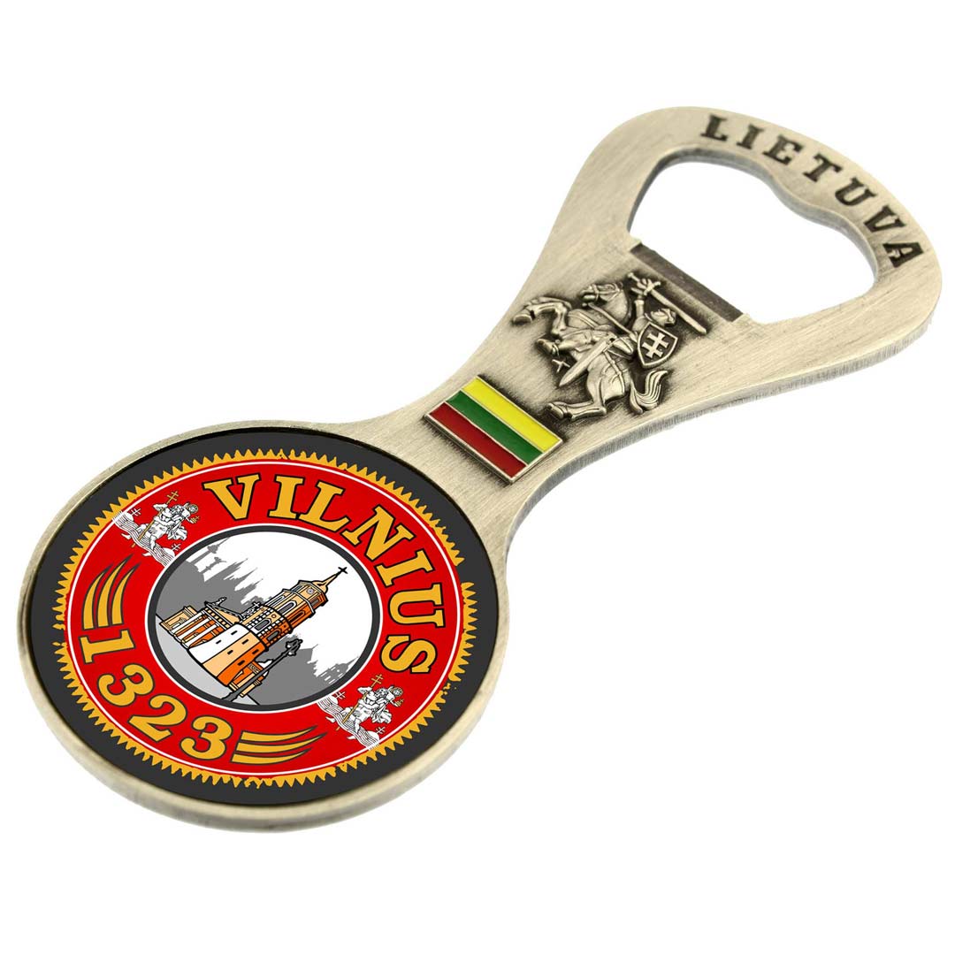 Metalinis butelio atidarytuvas su magnetu – praktiškas ir simboliškas suvenyras iš Lietuvos sostinės Vilniaus. Ryškus dizainas su Vilniaus Arkikatedros atvaizdu, data 1323 ir užrašu VILNIUS išryškina miesto istorinę reikšmę.