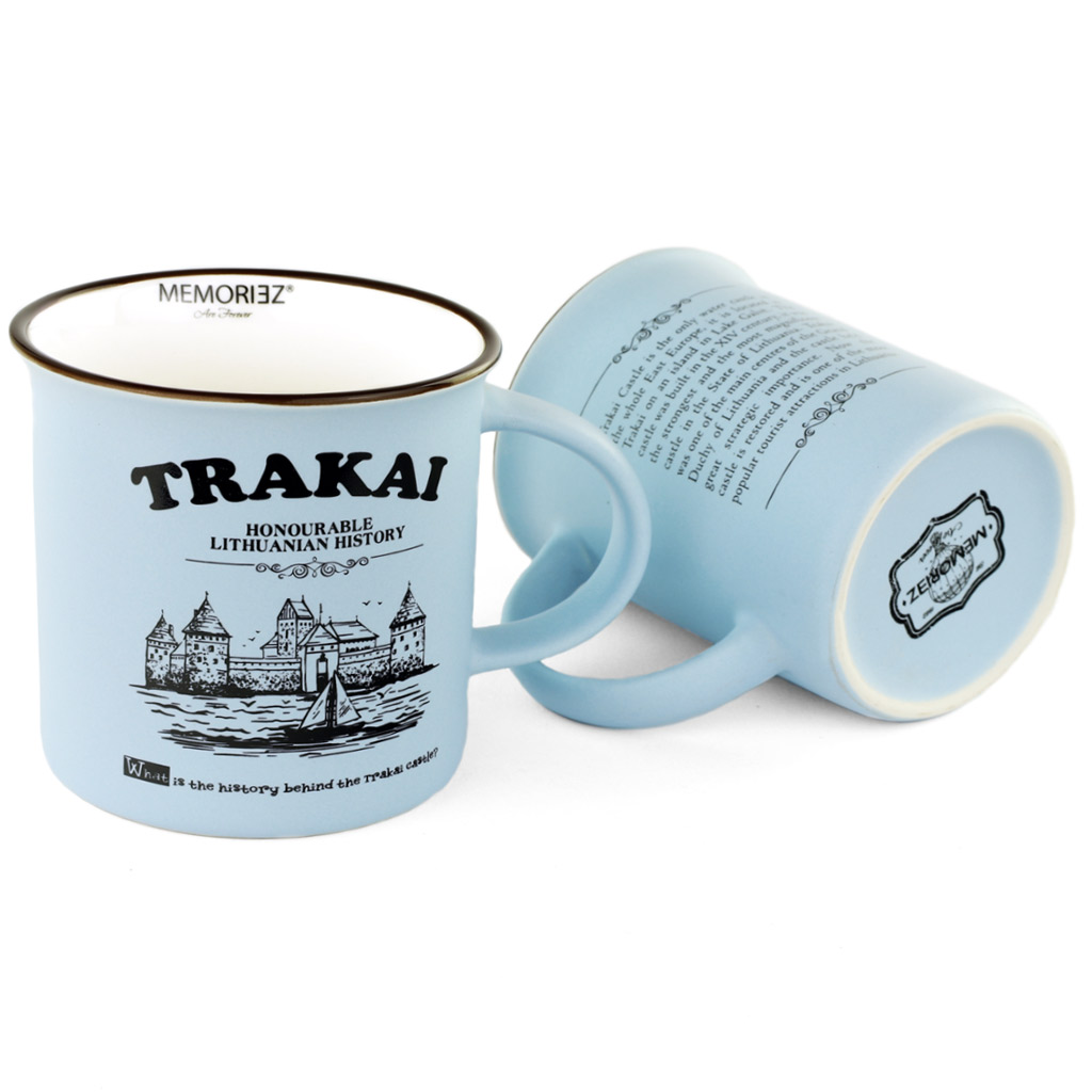 Pastelinė spalva suteikia puodeliui modernumo ir subtilumo, todėl jis puikiai dera tiek šiuolaikinėse, tiek tradicinėse suvenyrų kolekcijose. Antroje puodelio pusėje pateikiamas trumpas Trakų pilies istorijos aprašymas anglų kalba, kuris suteikia papildomos edukacinės vertės ir išskiria produktą iš kitų suvenyrų.