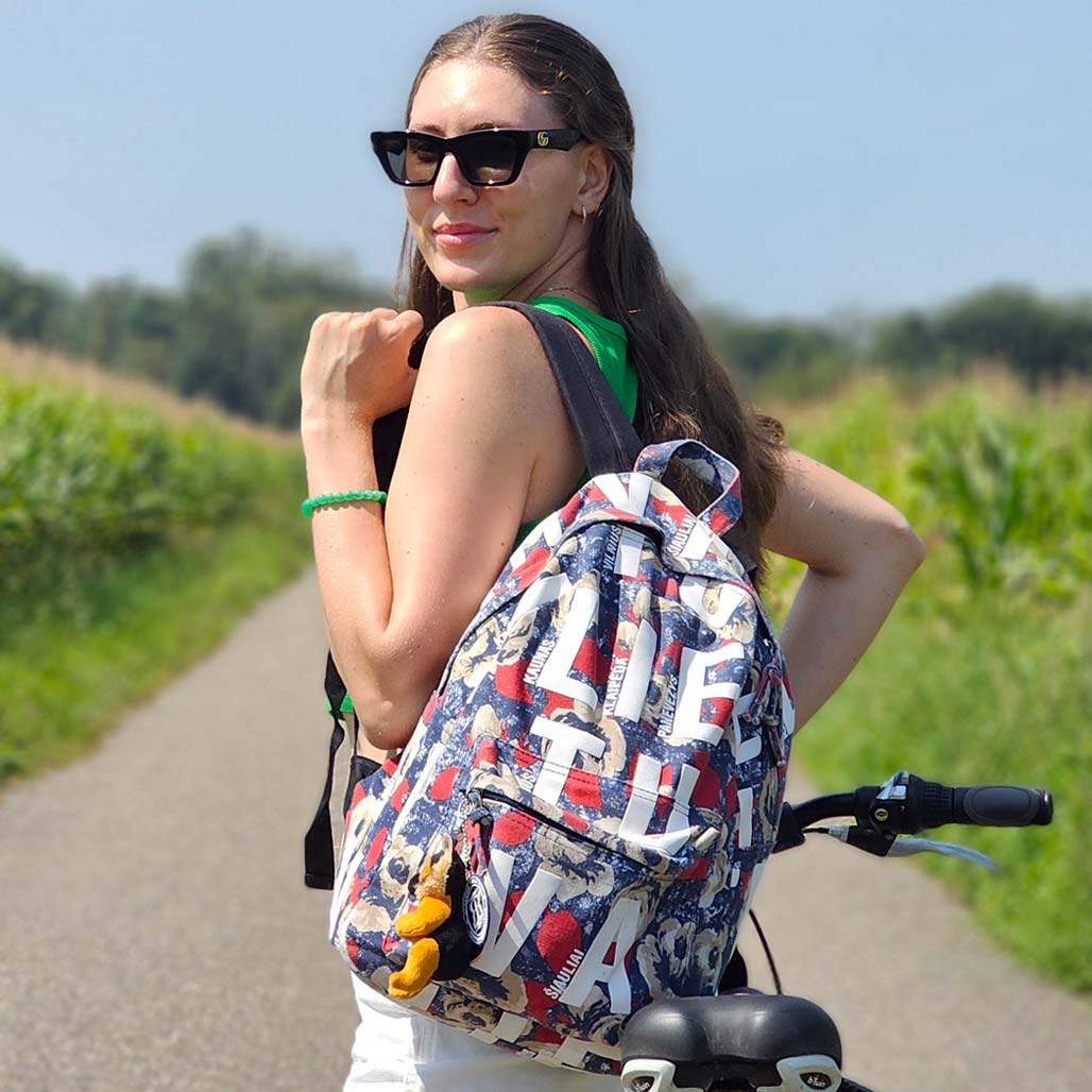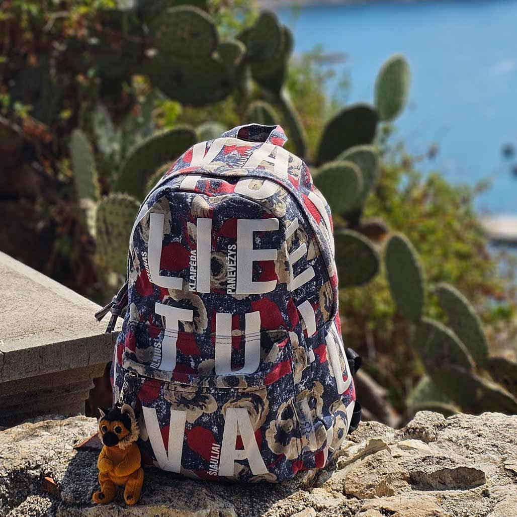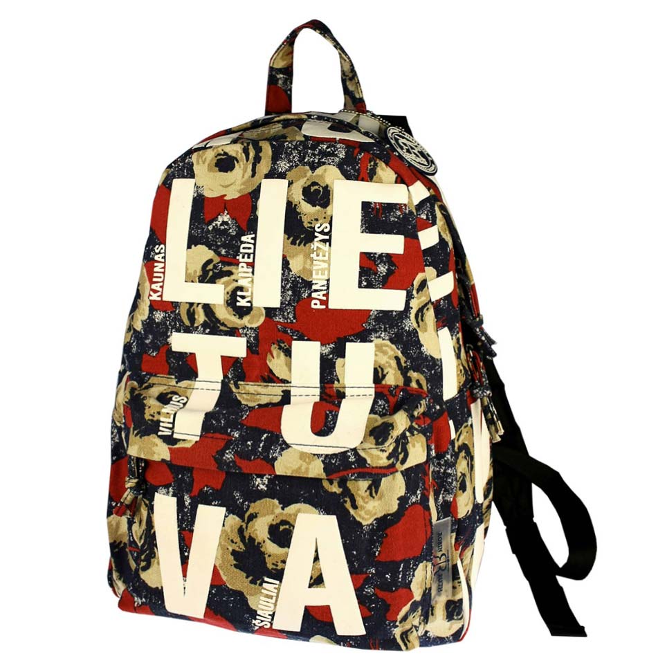 Gėlėta laisvalaikio kuprinė su užrašu „LIETUVA“ ir Lietuvos miestų pavadinimais – modernus ir išskirtinis aksesuaras kelionėms, miestui ir kasdieniam naudojimui. Kuprinė dekoruota didelėmis LIETUVA raidėmis ir tokių miestų kaip Kaunas, Klaipėda, Panevėžys pavadinimais, kurie suteikia dizainui aiškų lietuviškos atributikos identitetą. Gėlių raštas kartu su kontrastingomis spalvomis sukuria stilingą ir lengvai atpažįstamą vizualą.