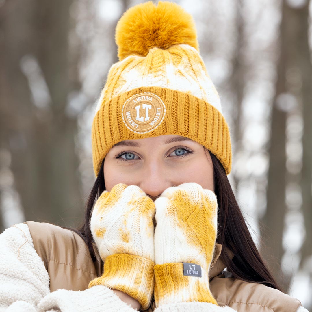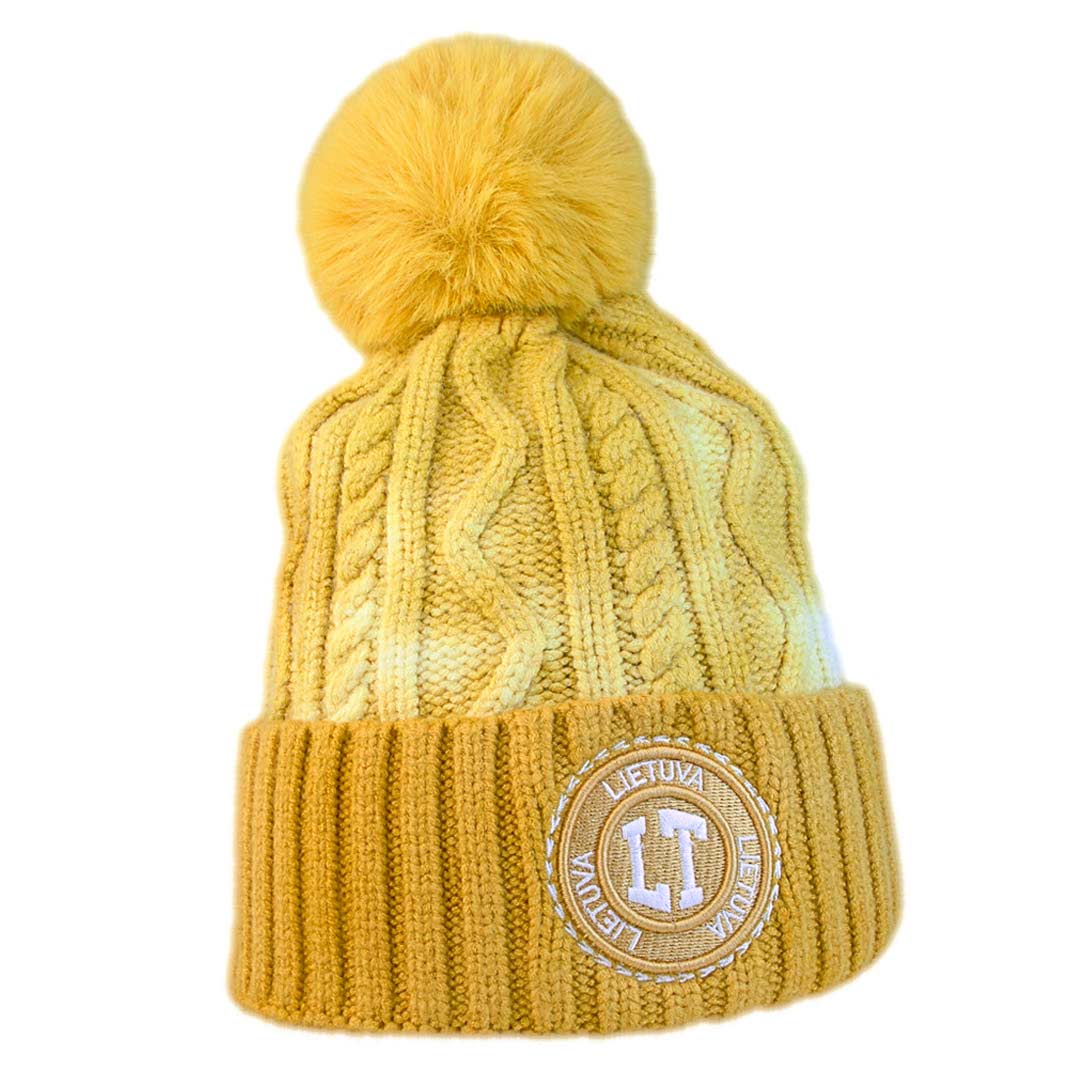 Ryškiai geltona žieminė kepurė su mielu bumbulu ir išsiuvinėtu LT simboliu – puikus pasirinkimas šaltajam sezonui. Ši stilinga ir šilta kepurė ne tik išryškina lietuvišką identitetą, bet ir puikiai dera prie žieminio garderobo.