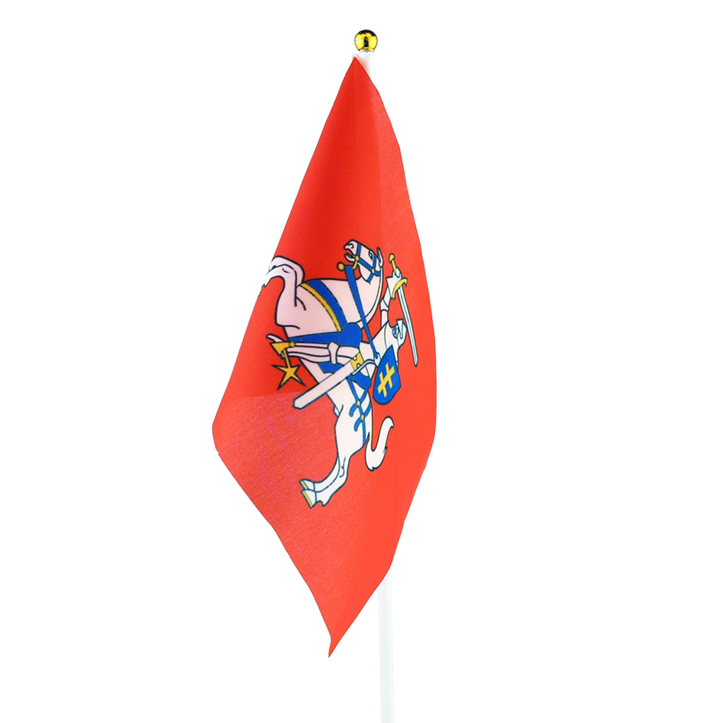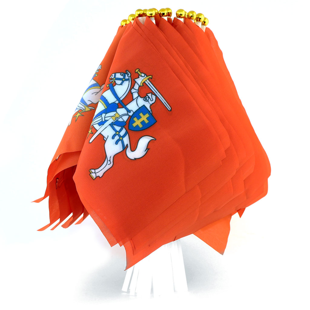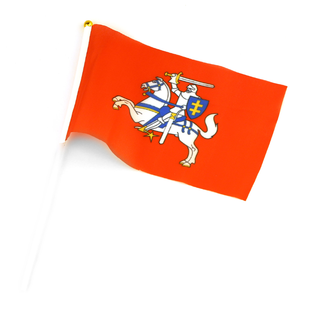Lietuvos istorinė rankinė vėliavėlė su Vyčiu, plastikiniu koteliu ir auksiniu antgaliu. Puikus pasirinkimas šventėms ir suvenyrams.