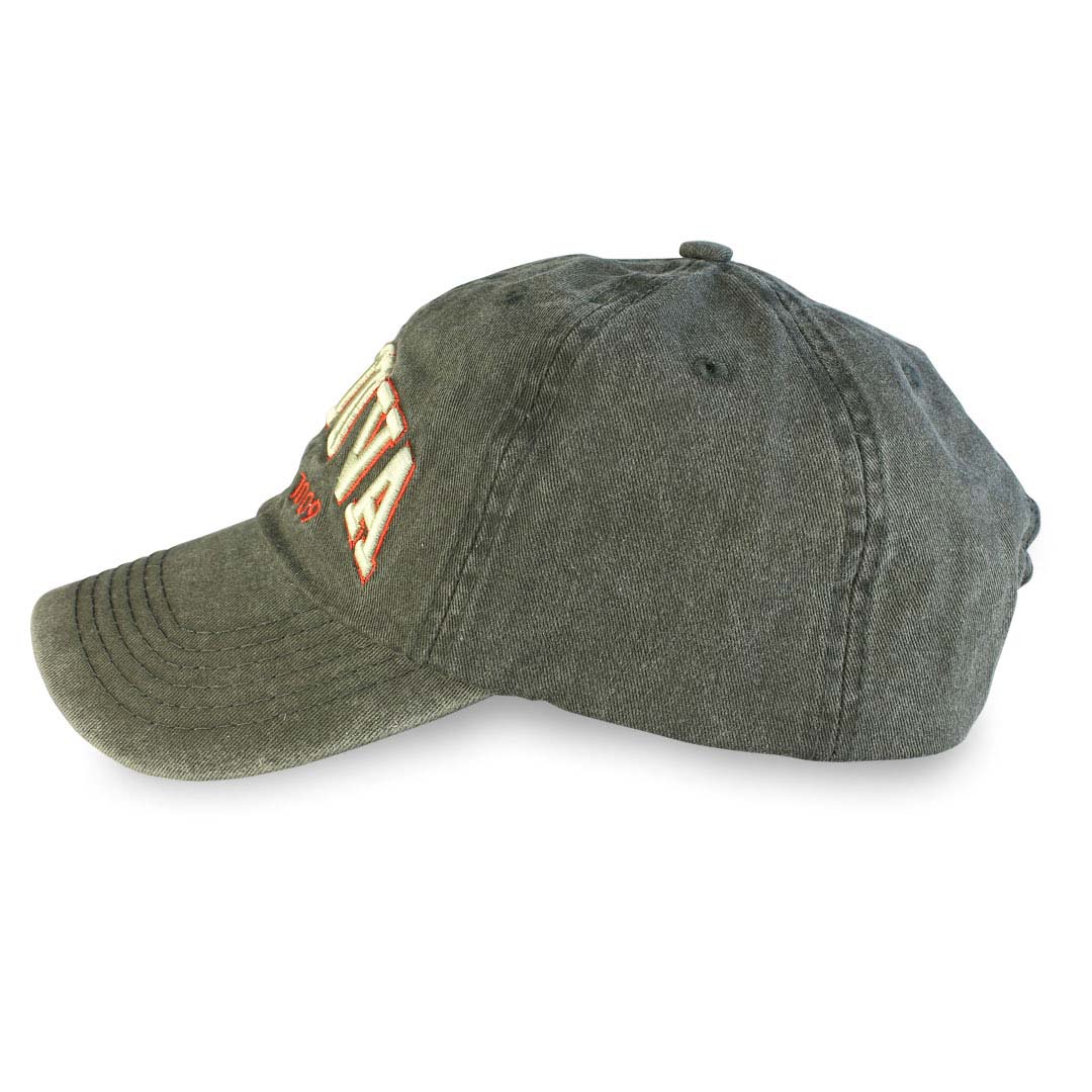 Tamsiai pilka džinsinė kepurė su išsiuvinėtu užrašu „LIETUVA Original 1009“. Idealus pasirinkimas keliautojams ir patriotams.