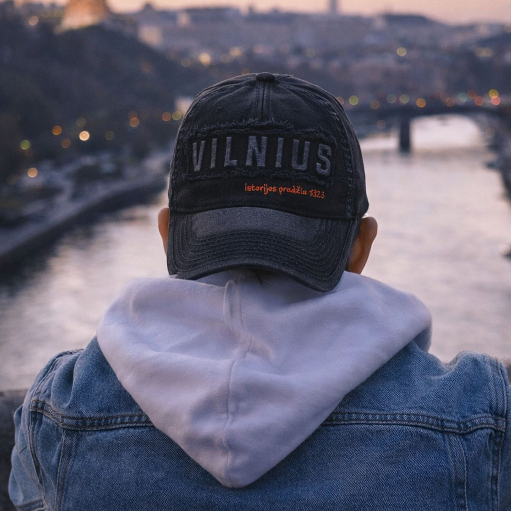 Juoda retro stiliaus kepurė „Vilnius 1323“ – tai stilingas ir modernus aksesuaras miesto gerbėjams bei keliautojams. Retro stiliaus „distressed“ efektas, specialiai sendintos siūlės ir reljefinis „VILNIUS“ užrašas suteikia kepurei išskirtinį charakterį.