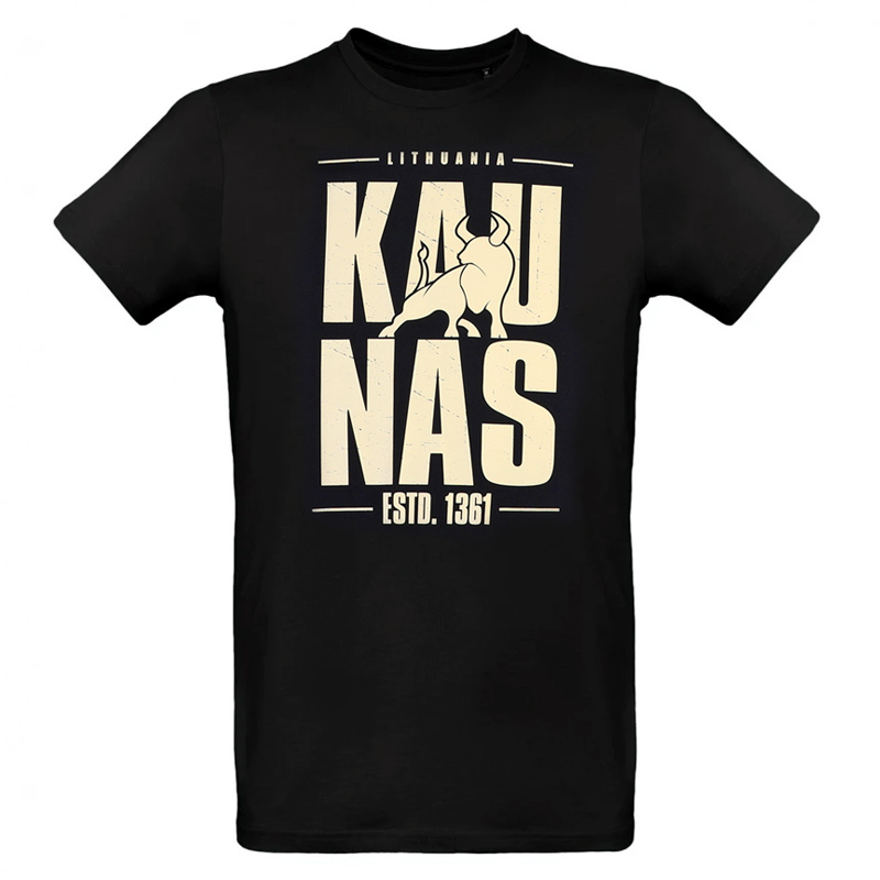 Juodi organinės medvilnės medium fit marškinėliai su „Kaunas Lithuania ESTD 1361“ dizainu ir Kauno tauro simbolika.
