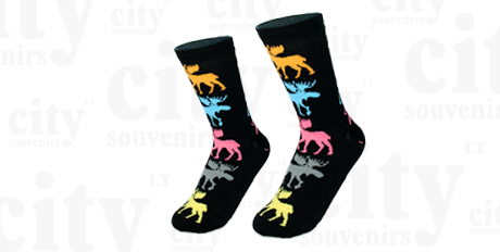 Juodos medvilninės moteriškos kojinės su spalvotai briedžiais.