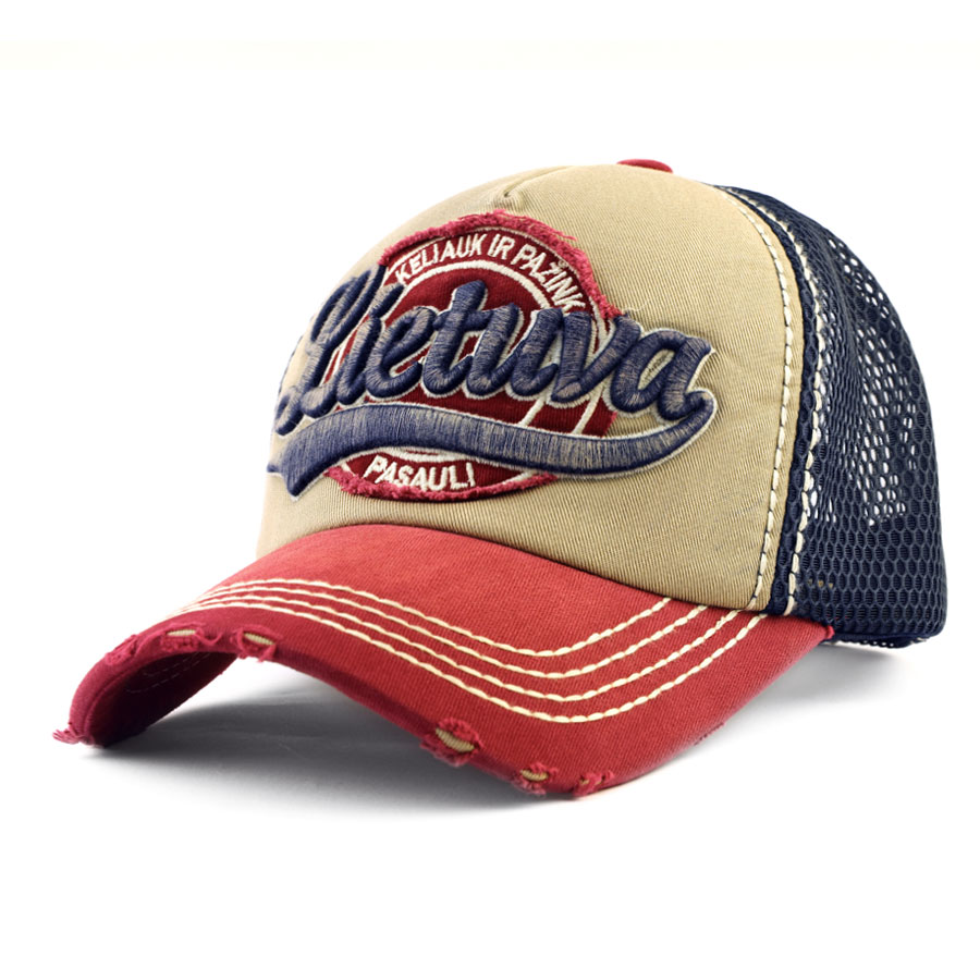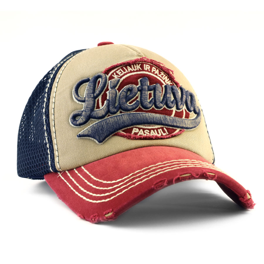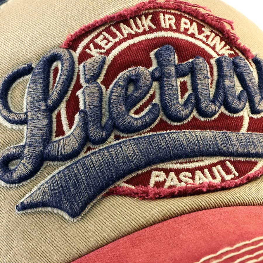 Robin Ruth retro kepurė „Lietuva – Keliauk ir pažink pasaulį“ su tinkleliu ir reguliuojamu užsegimu. Kokybiškas ir stilingas aksesuaras kelionėms.