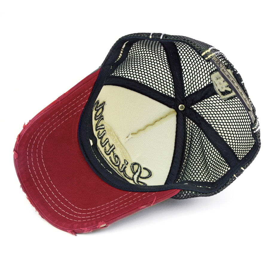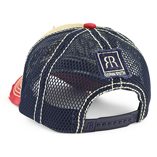Smėlio, raudonos ir tamsiai mėlynos spalvų derinys bei sendinto stiliaus detalės suteikia šiai kepurei unikalumo.