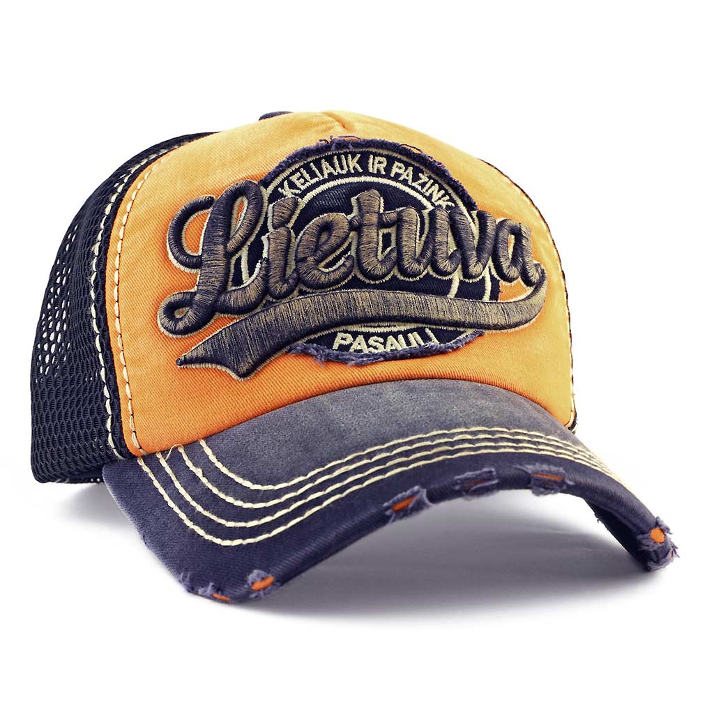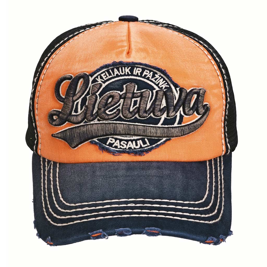 Retro stiliaus kepurė „Lietuva – Keliauk ir pažink pasaulį“ išsiskiria ryškiu oranžinės ir tamsiai mėlynos spalvų deriniu bei sendinto efekto detalėmis.