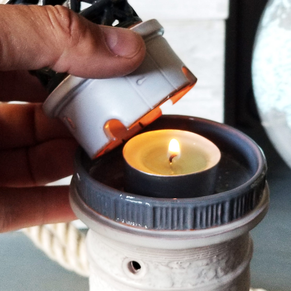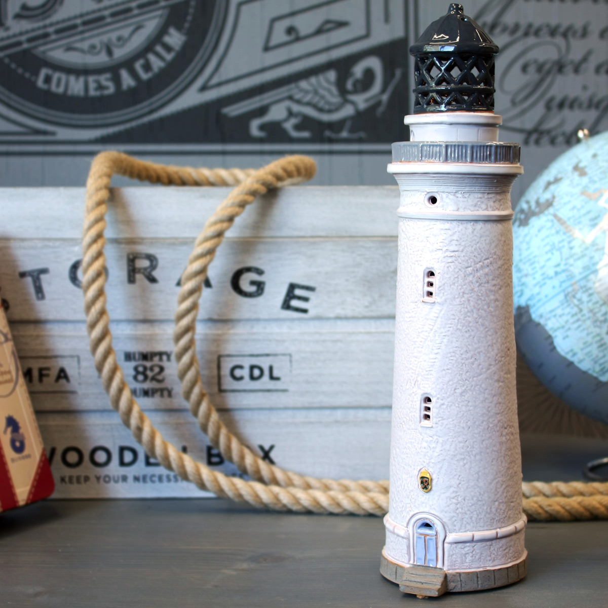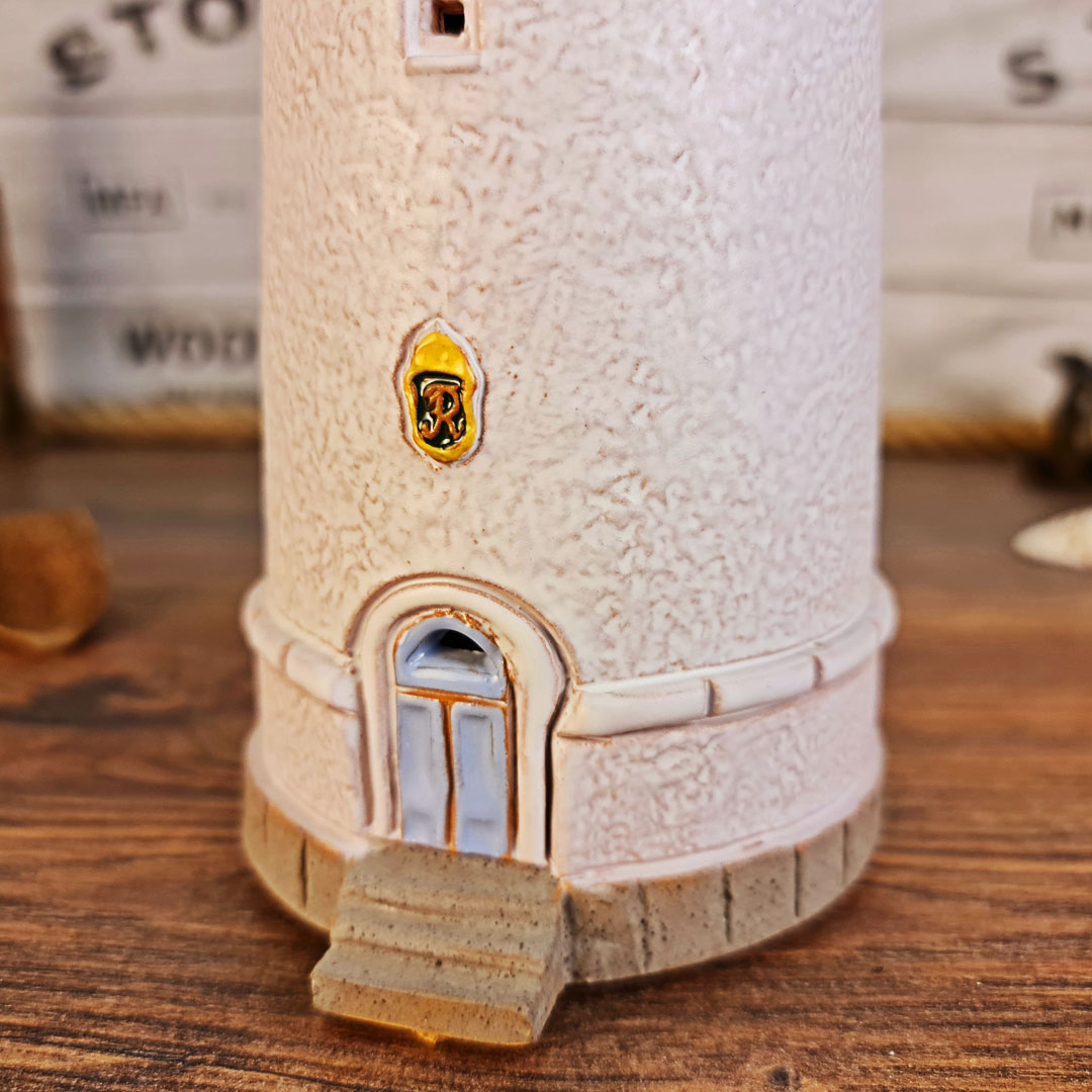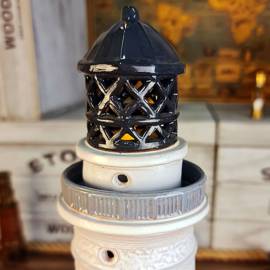 Viršutinėje švyturio dalyje lengvai įstatoma arbatinė žvakė, kurios šviesa sklinda pro langelius ir sukuria šiltą atmosferą. Dugne esantys kamštiniai padeliai apsaugo paviršius nuo subraižymo.