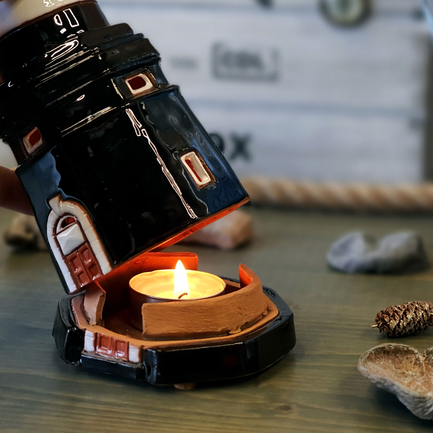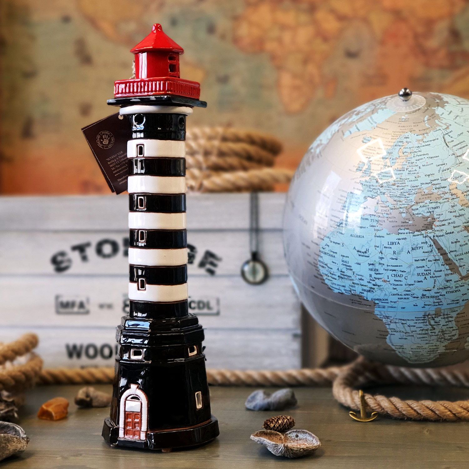 Švyturys ne tik dekoratyvus, bet ir funkcionalus – apatinėje dalyje yra vieta žvakutei, kuri suteikia jaukios, šiltos šviesos ir sukuria ypatingą atmosferą.