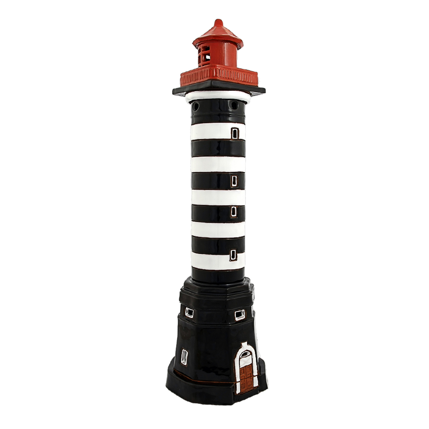 Išskirtinis rankų darbo keramikinis švyturys žvakidė – tai unikalus interjero akcentas, sukurtas pagal autentišką Klaipėdos švyturio modelį. Juodai balti dryžiai ir ryškus raudonas viršus atkuria klasikinį jūrinį stilių, kuris puikiai tiks tiek namų, tiek poilsio erdvių dekorui.