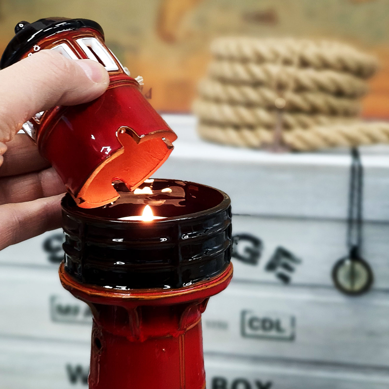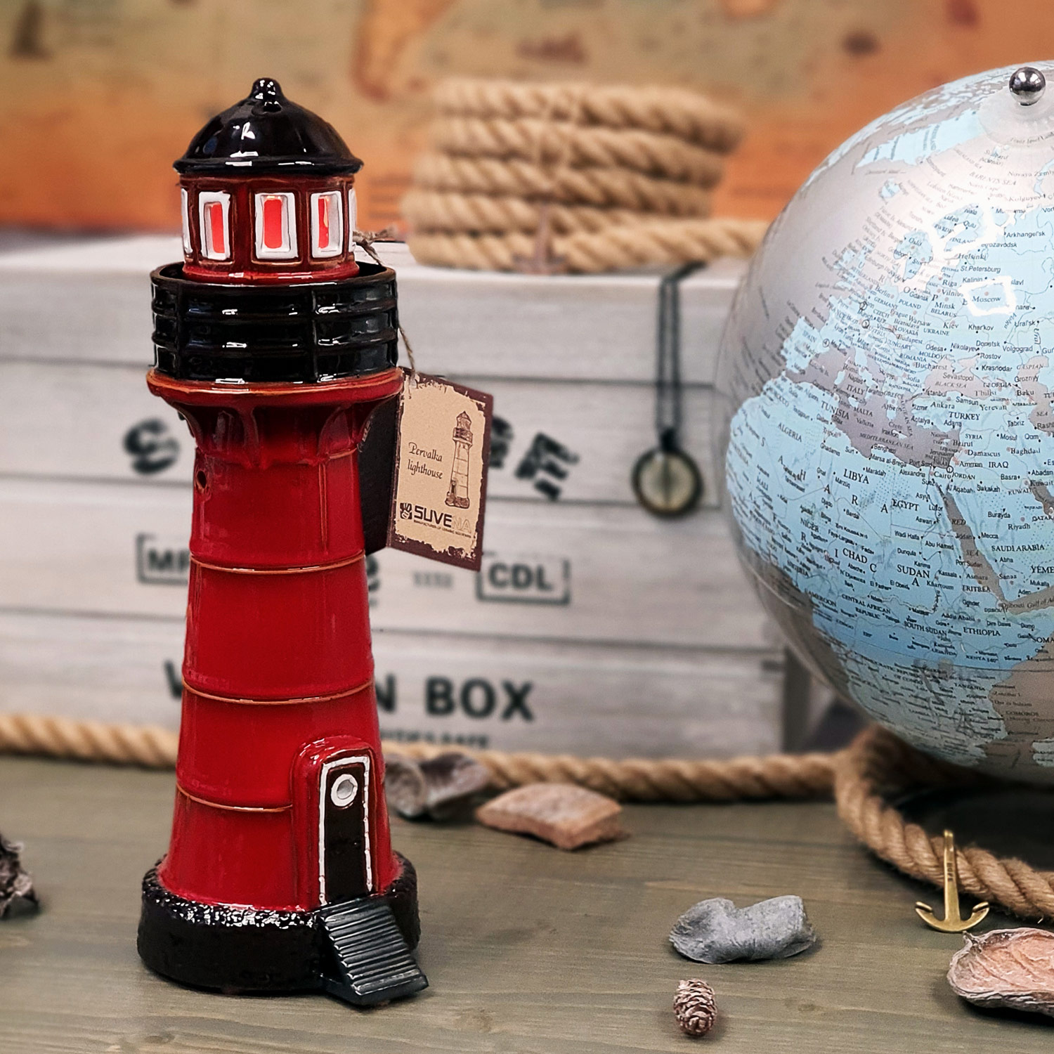Švyturys yra ne tik dekoratyvus, bet ir funkcionalus – viduje galima įdėti žvakutę, kuri sukuria jaukią, šiltą šviesą ir išryškina švyturio langelius.