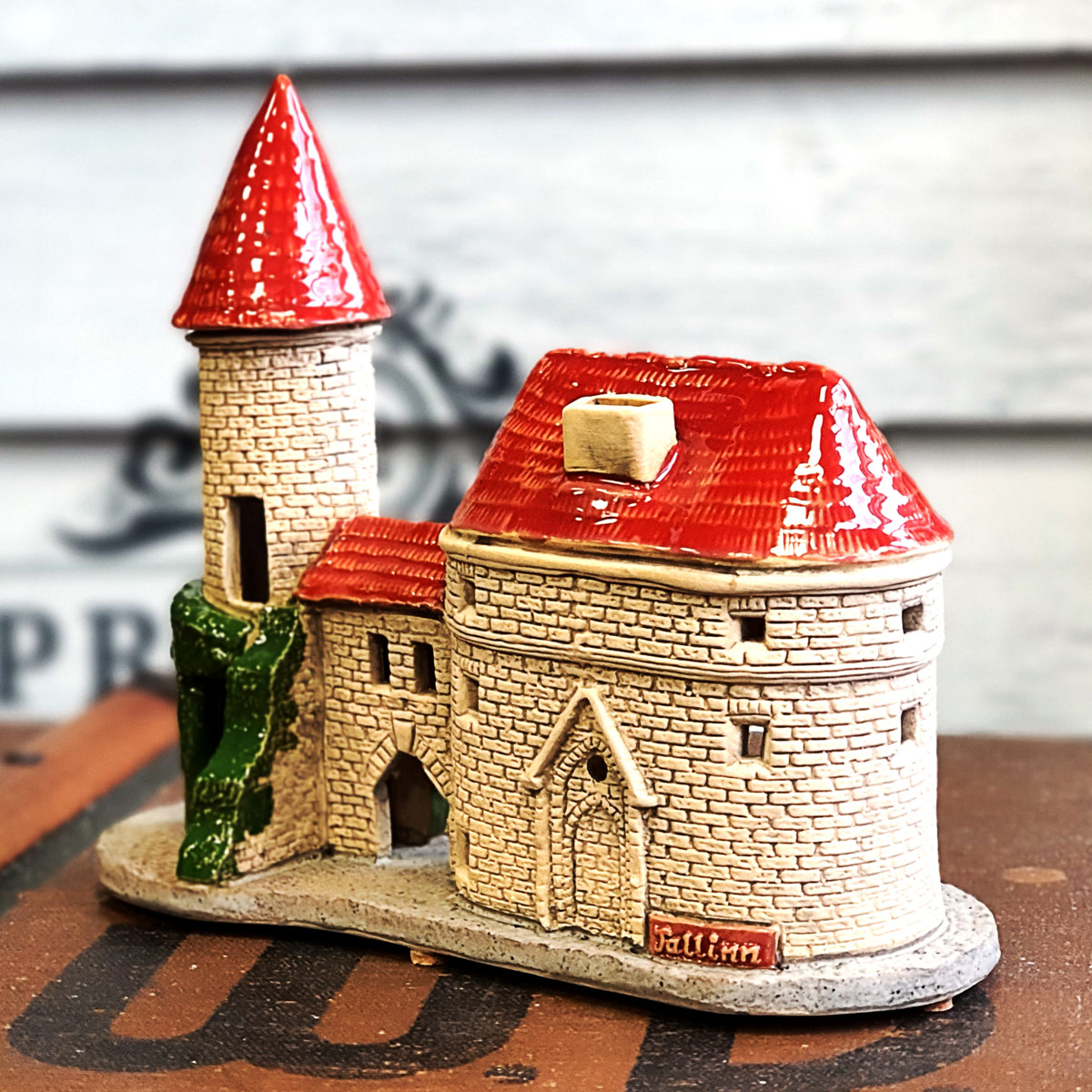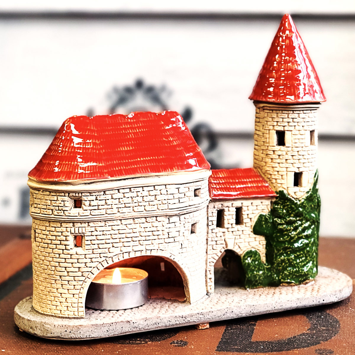 Rankų darbo keraminė Virų vartų žvakidė – Talino simbolis, dekoratyvus suvenyras su jaukia žvakės šviesa.