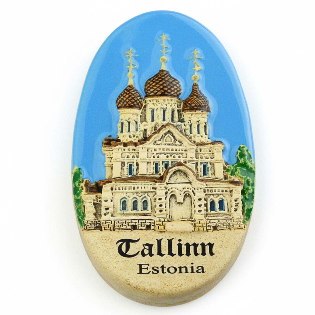 Ovalus keraminis magnetas su A. Nevsky katedra Taline – klasikinis suvenyras.