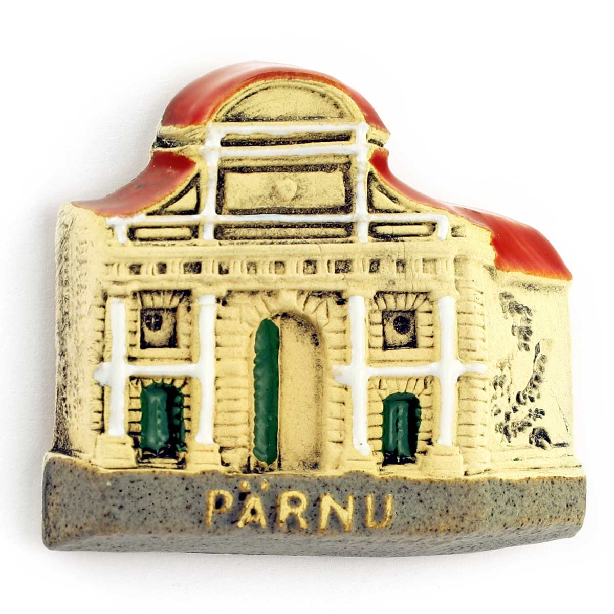 Keraminis šaldytuvo magnetas „Pärnu Talino vartai“ – autentiškas suvenyras, vaizduojantis vieną žymiausių Estijos kurorto architektūros objektų – Tallinn Gate.