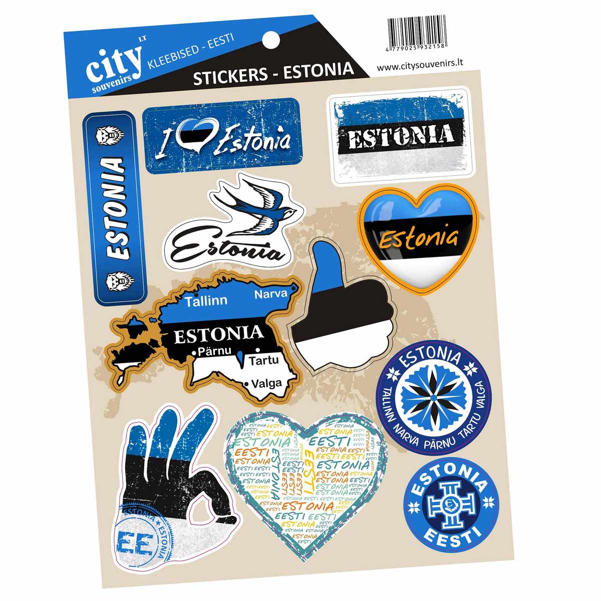 Spalvingas ir modernus lipdukų rinkinys „Estonia“ – puikus suvenyras keliautojams ir Estijos gerbėjams. Rinkinį sudaro 11 skirtingų lipdukų, kuriuose atsispindi Estijos simbolika: šalies vėliava, žemėlapis su miestais (Tallinn, Tartu, Narva, Pärnu), stilizuoti užrašai „Estonia“ bei modernūs grafiniai elementai. Lipdukai puikiai tinka dekoruoti: