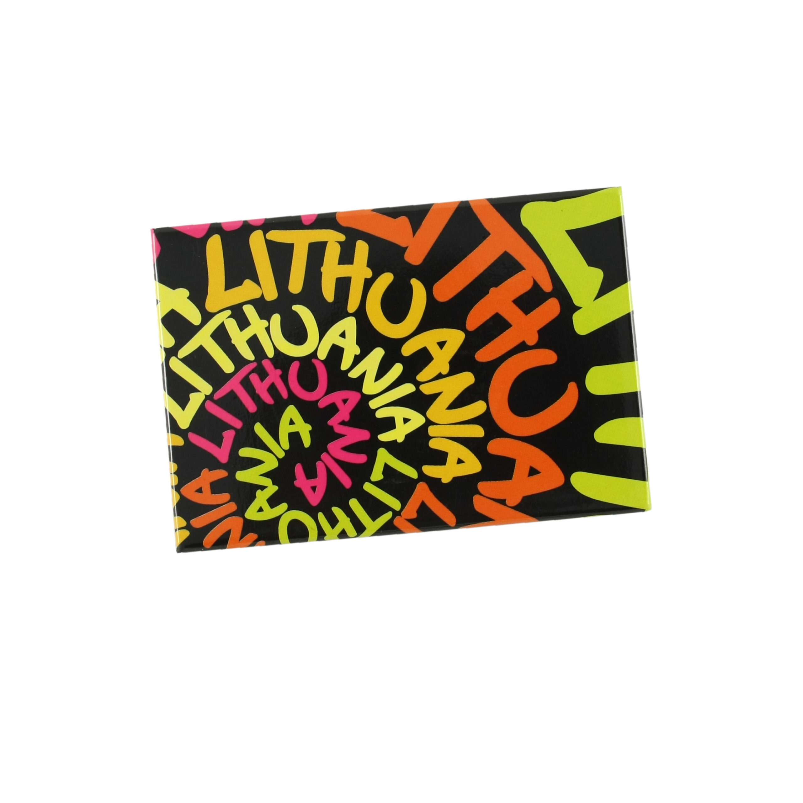Ryškus „Lithuania“ magnetas su spalvotu tipografiniu dizainu juodame fone.