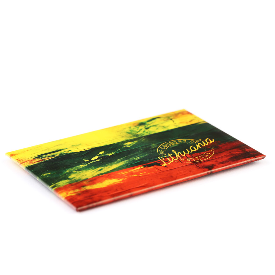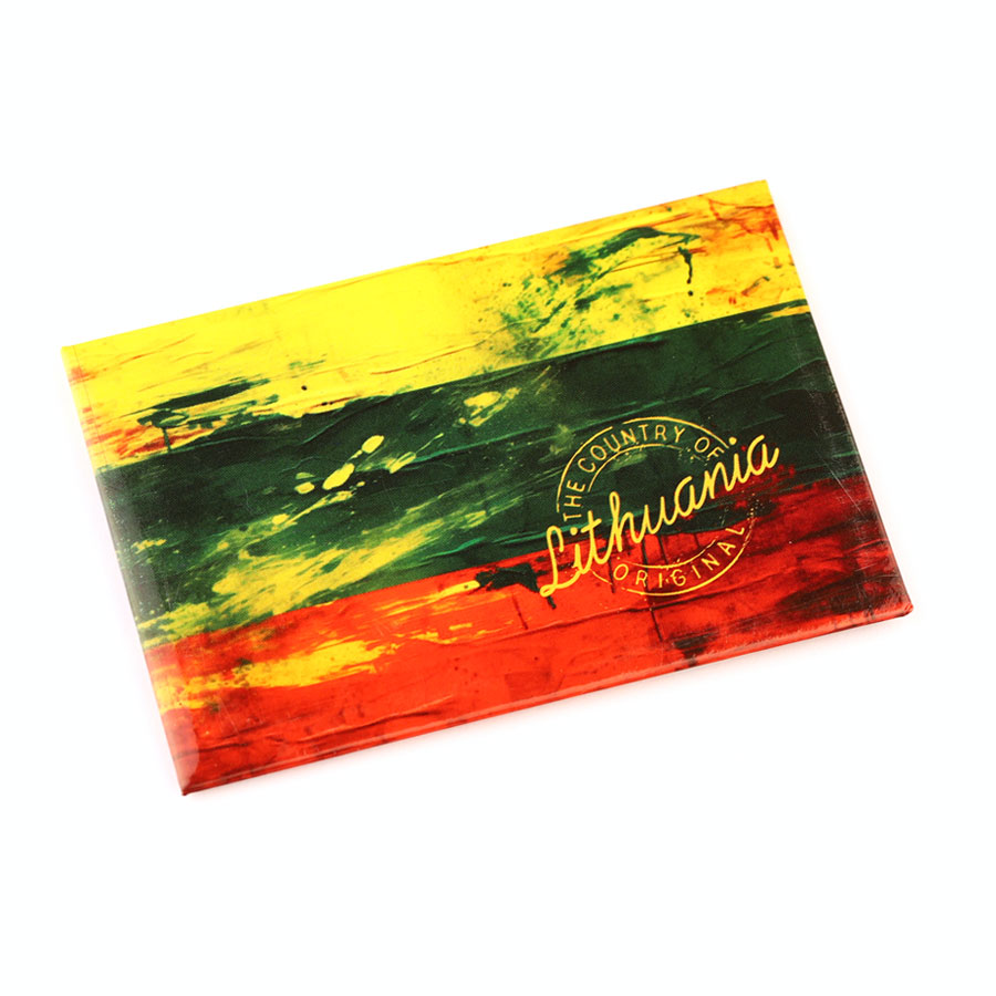 Modernus magnetas su Lietuvos trispalve ir užrašu „Lithuania – The Country of Original“.