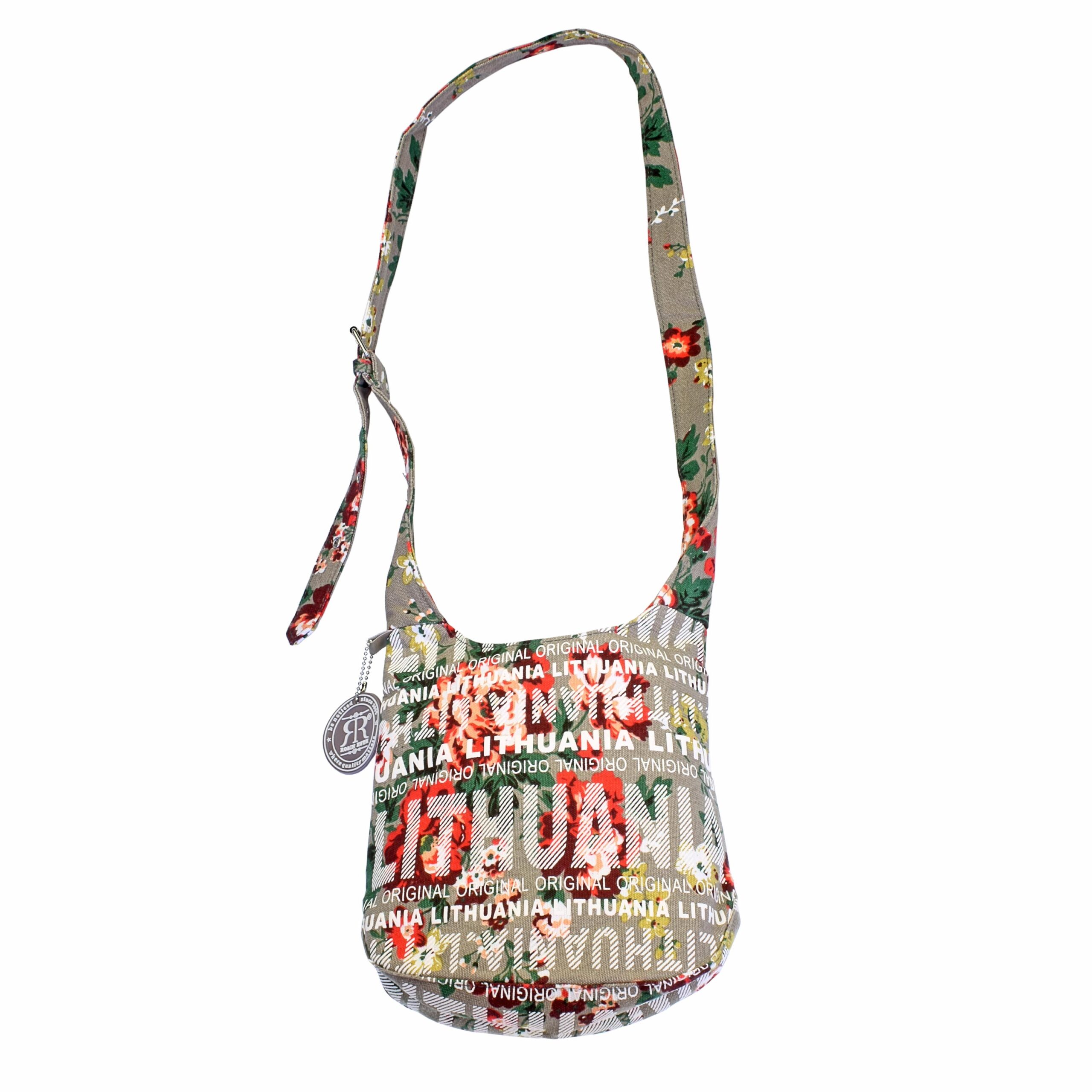 Maža gėlėta rankinė su užrašu Lithuania Original ir reguliuojama ilga petneša – stilingas kasdienis aksesuaras.