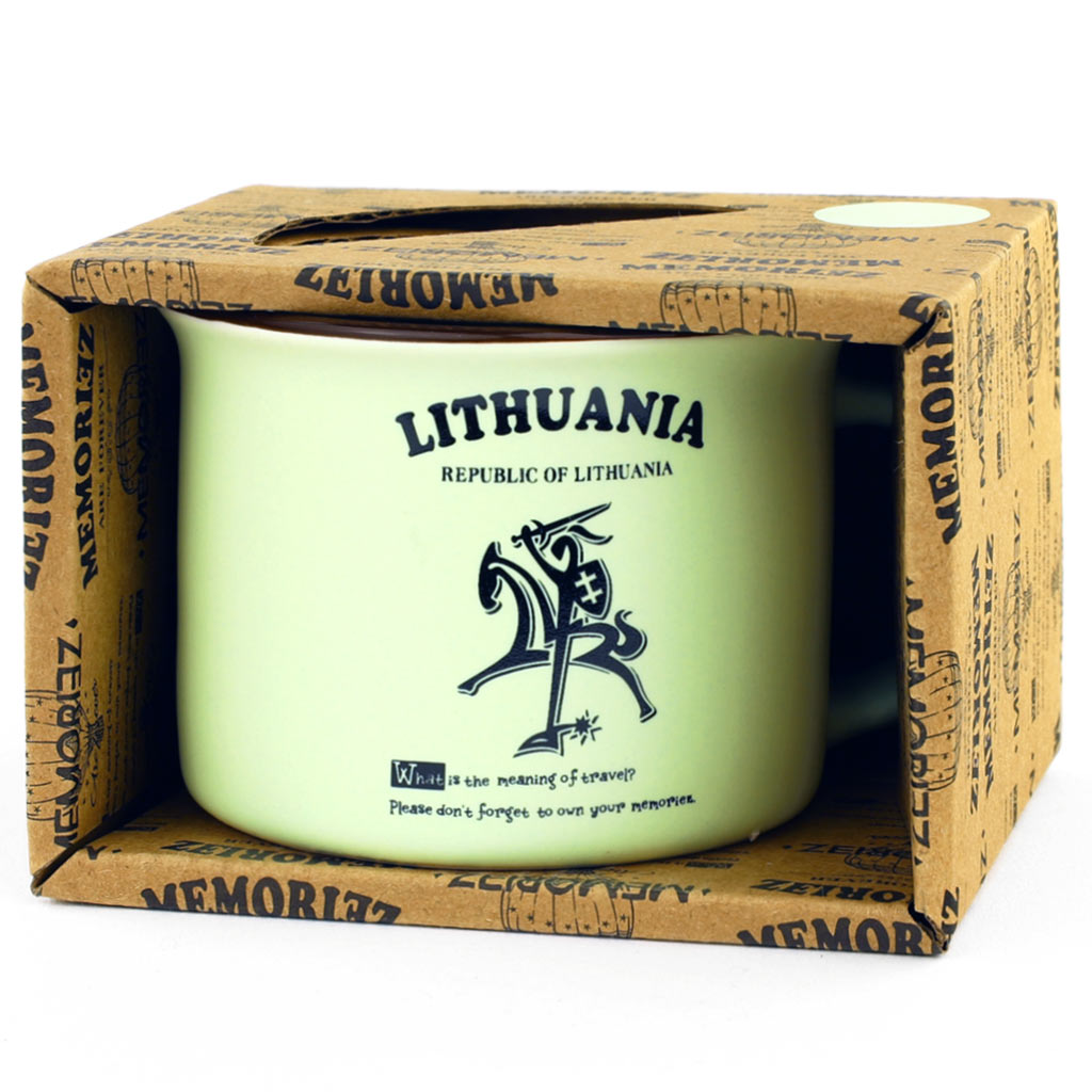 Pastelinės žalios spalvos keramikinis puodelis su Lietuvos simbolika – Vyčiu ir užrašu „Lithuania – Republic of Lithuania“ yra puikus suvenyras, skirtas turistams, suvenyrų parduotuvėms ir dovanų asortimentui. Kompaktiško dydžio (150 ml) puodelis idealiai tinka espresso ar mažai kavos porcijai, todėl yra patrauklus kaip praktiška ir simbolinė dovana iš Lietuvos.