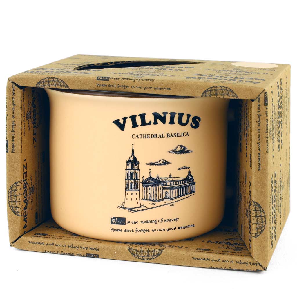 Pastelinis puodelis Vilnius Cathedral Basilica, 150 ml. Su istorija ir dėžute – modernus suvenyras turistams.