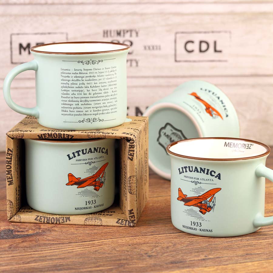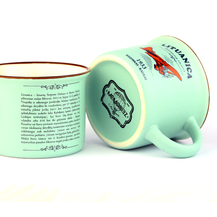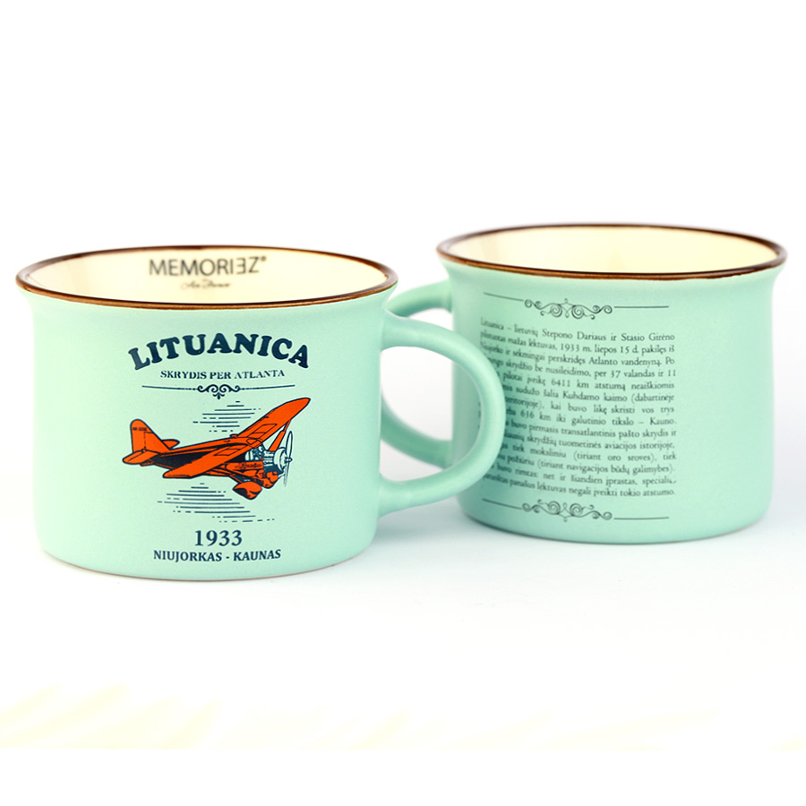 Kompaktiškas, žalsvos (pastelinės) spalvos suvenyrinis puodelis „Lituanica – Skrydis per Atlantą“, skirtas legendiniam 1933 m. Stepono Dariaus ir Stasio Girėno skrydžiui įamžinti.