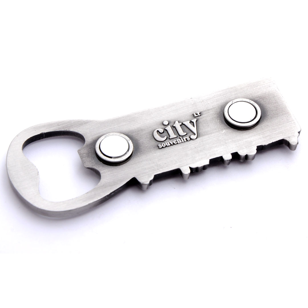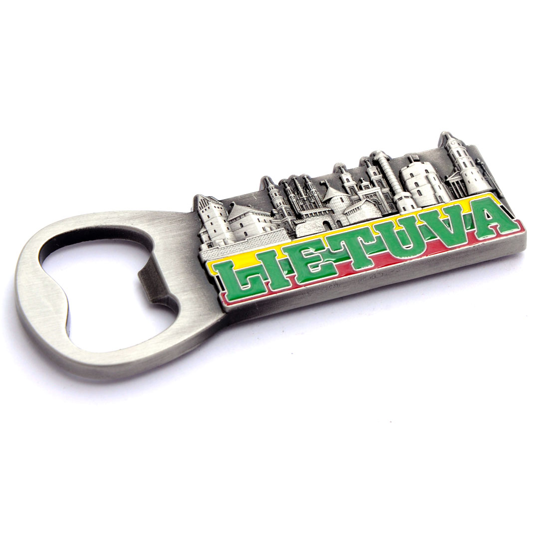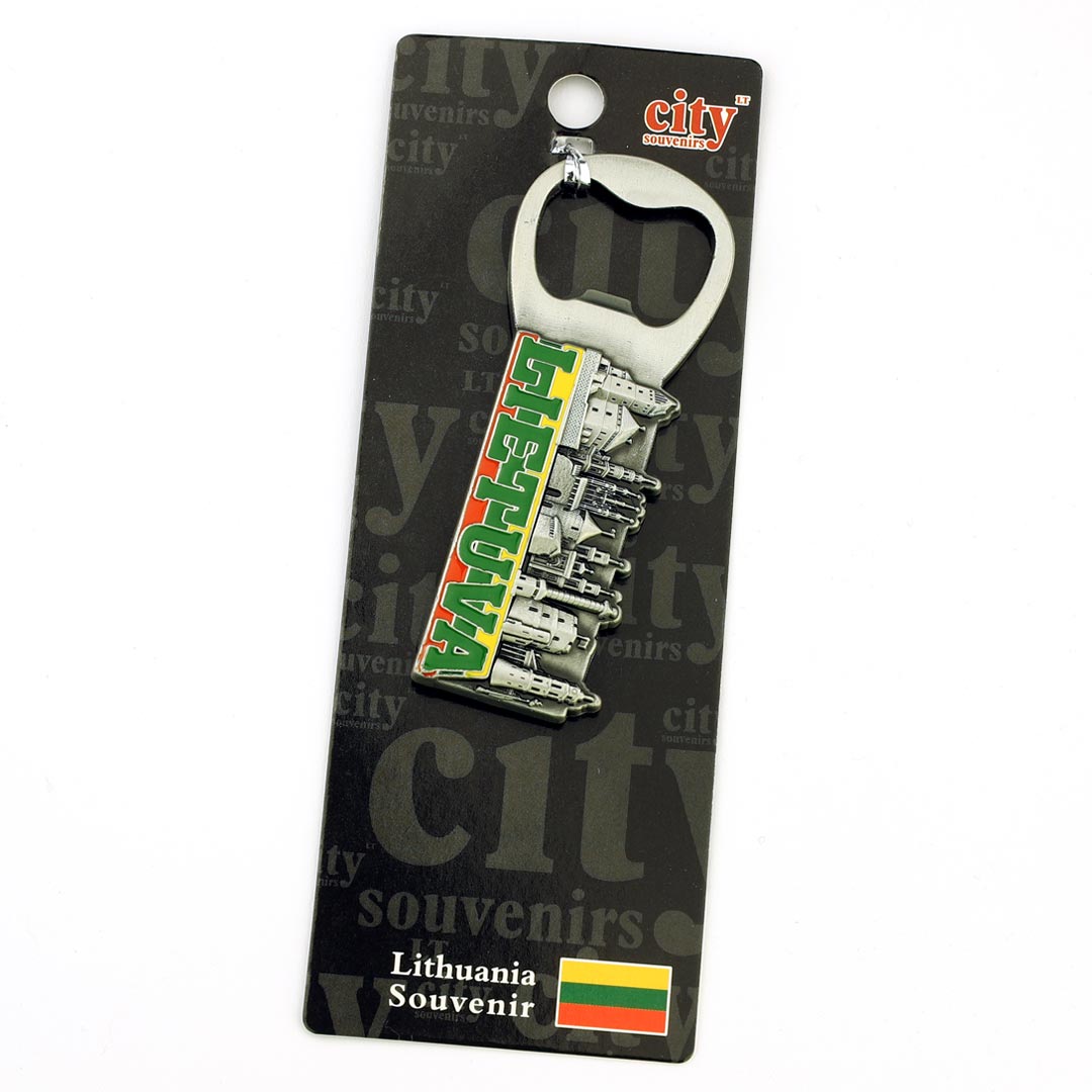 Daugiafunkcis suvenyrinis magnetas su Lietuvos miestų senamiesčio reljefu ir spalvotu LIETUVA užrašu. Tinka kaip butelio atidarytuvas bei puošmena šaldytuvui.