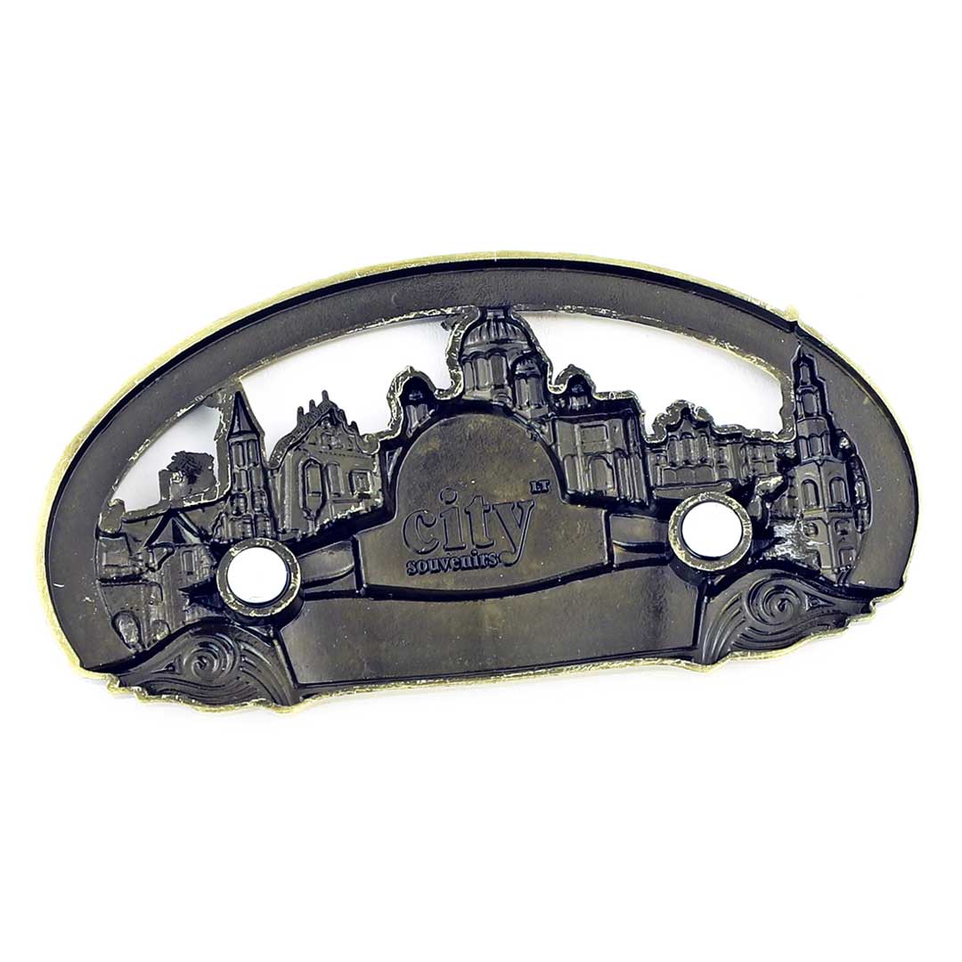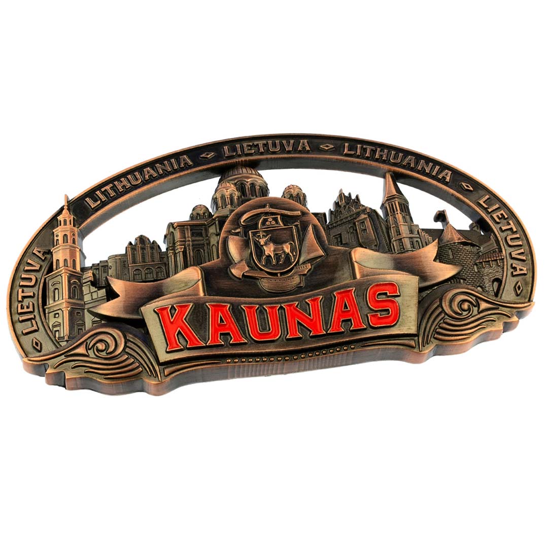 Aukštos kokybės metalinis magnetas su Kauno miesto simboliais: miesto herbu, rotuše, Soboru, Perkūno namu, Vytauto Didžiojo bažnyčia ir Kauno pilimi. Išskirtinis vario atspalvis suteikia jam autentiškumo ir senovinio žavesio, kuris puikiai dera prie klasikinio interjero ar suvenyrų kolekcijos.
