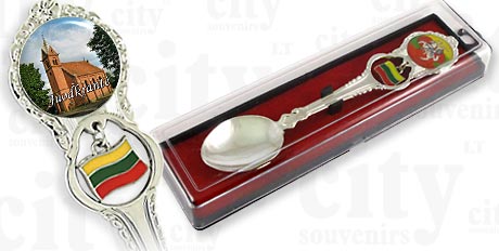 Suvenyras – Metalinis šaukštelis su vėliavėle – Juodkrantė. Šaukštelis supakuotas plastiko dėžutėje.