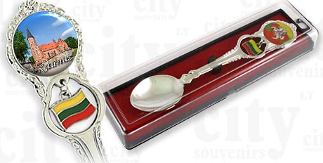 Suvenyras – Metalinis šaukštelis su vėliavėle – Kaunas Vytauto Didžiojo bažnyčia. Šaukštelis supakuotas plastiko dėžutėje.
