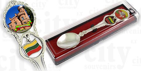 Suvenyras – Metalinis šaukštelis su vėliavėle Lietuva Raudonės pilis. Šaukštelis supakuotas plastiko dėžutėje.