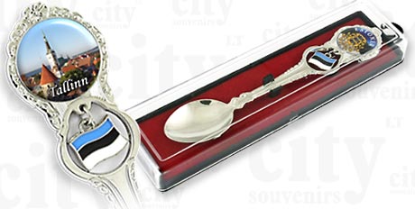 Suvenyras – Metalinis šaukštelis su vėliavėle Talino Panorama. Šaukštelis supakuotas plastiko dėžutėje.