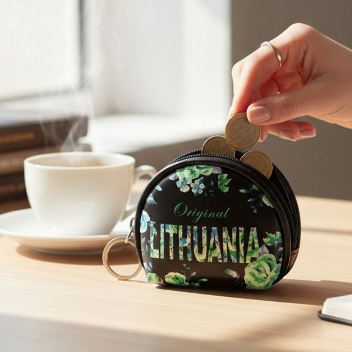 Stilinga monetų piniginė „Lithuania Original“ su žalsvų atspalvių gėlėtu dizainu – praktiškas ir išskirtinis aksesuaras kasdienai.