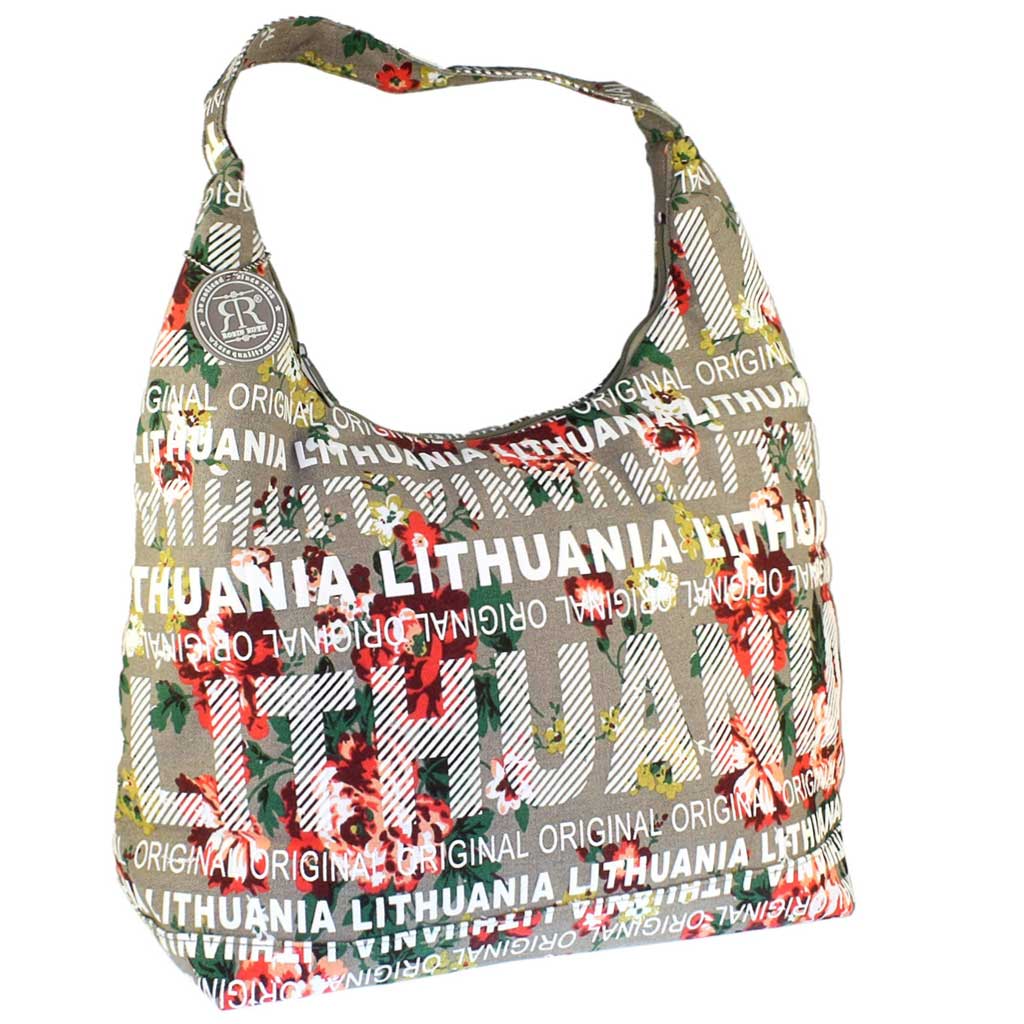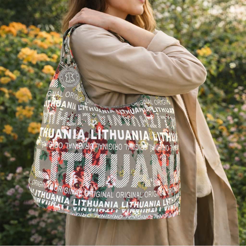 Stilinga ir praktiška moteriška rankinė „Lithuania“ – modernus aksesuaras kasdienai, kelionėms ir puikus suvenyras iš Lietuvos. Rankinė pasiūta iš tvirto 100% medvilninio brezento, dekoruota gėlių raštu ir išraiškingu „Lithuania“ dizainu. Šis modelis išsiskiria subtilia rusva spalva bei stilingu kelionių suvenyrams būdingu dizainu, kuris patraukia turistų ir keliautojų dėmesį. Rankinė turi vieną pagrindinį skyrių, kuris užsegamas užtrauktuku. Viduje yra patogi užsegama kišenė smulkiems daiktams bei papildoma kišenėlė mobiliajam telefonui. Plati viena petneša leidžia patogiai nešioti rankinę ant peties. Tai aukštos kokybės Robin Ruth gaminys – vieno žinomiausių pasaulyje kelionių suvenyrų ir miestų atributikos gamintojų.