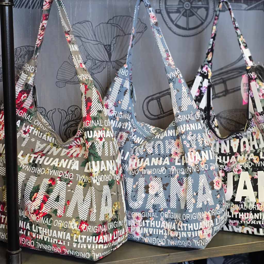 Stilinga moteriška gėlėta rankinė su užrašu „Lithuania“. Pagaminta iš tvirto 100% medvilninio brezento, su vienu pagrindiniu skyriumi, vidine kišene ir užtrauktuku. Kokybiškas Robin Ruth Lithuania suvenyras.