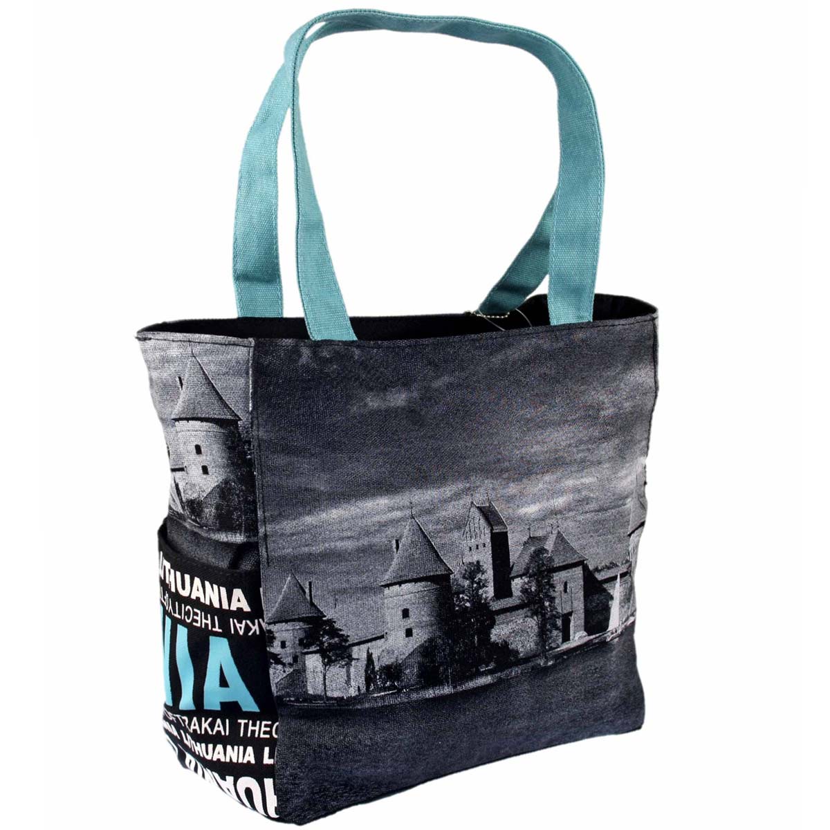 Moteriška medvilninė rankinė su Trakų pilies dizainu – stilingas ir praktiškas kasdienis aksesuaras. Turi kelias kišenes ir užtrauktuką patogiam naudojimui.