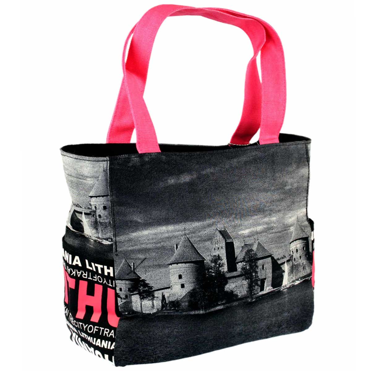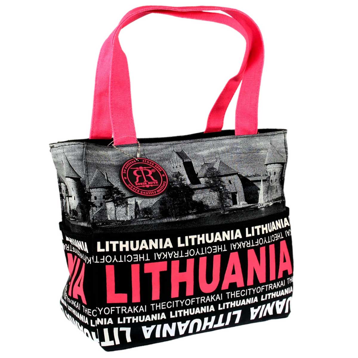 This stylish women’s bag featuring Trakai Castle design combines Lithuanian identity with modern fashion. Made from 100% cotton, it offers durability and comfort for everyday use. With multiple compartments and eye-catching pink handles, this Robin Ruth bag is perfect for travel, shopping, or daily wear.