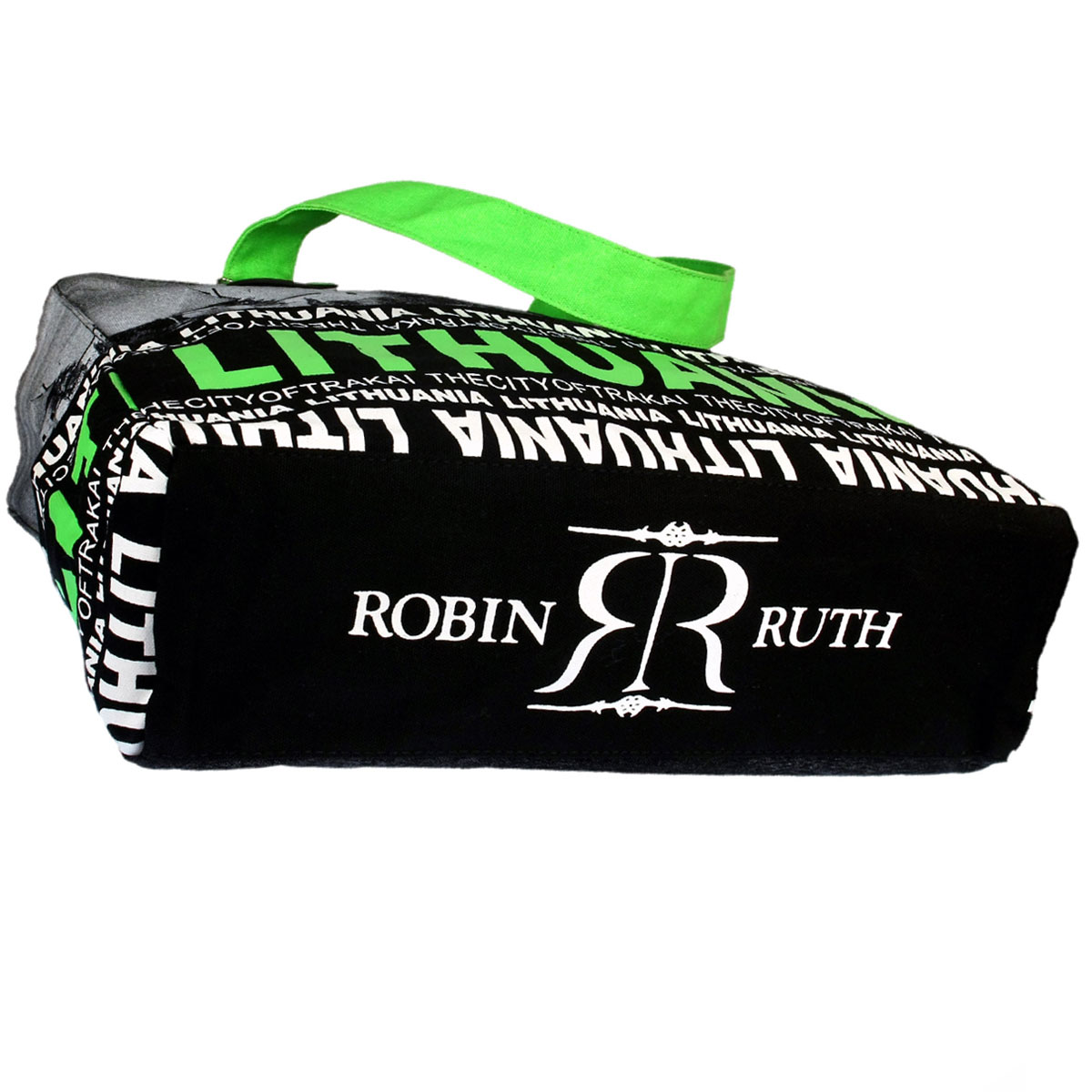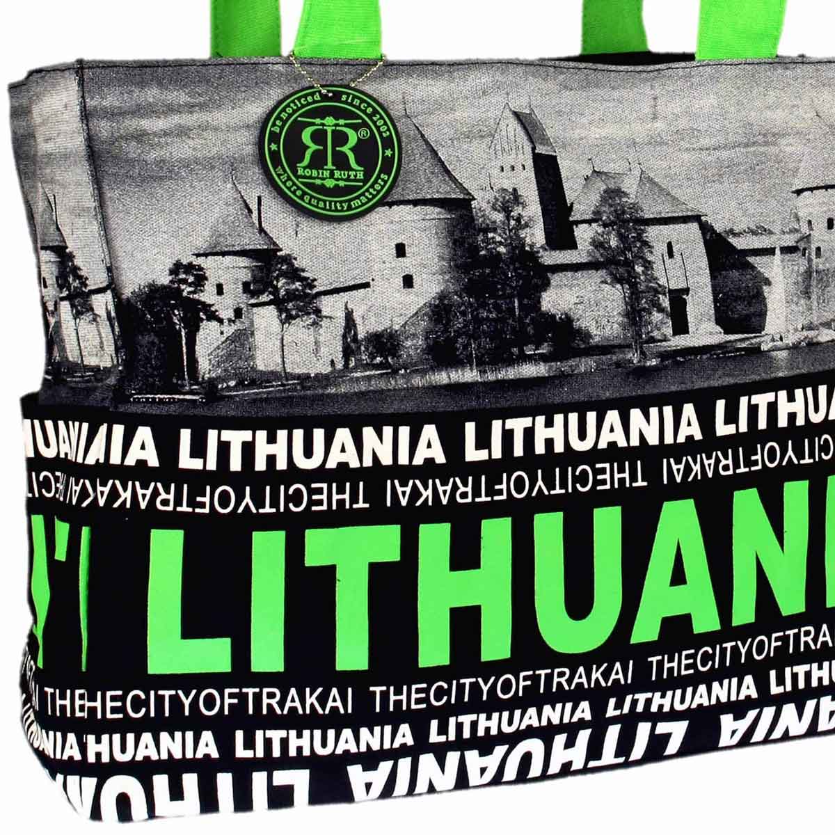 Išskirtinė ir talpi moteriška rankinė „Lithuania Trakai“ (žalia versija) – modernus lietuviškas aksesuaras su ryškiu dizainu ir panoraminiu Trakų pilies vaizdu. Kontrastingos žalios rankenos ir užrašai suteikia šiam modeliui išskirtinumo bei puikiai patraukia turistų dėmesį. Rankinė pagaminta iš 100% medvilnės, todėl yra lengva, patvari ir tinkama kasdieniam naudojimui. Didelis pagrindinis skyrius su užtrauktuku leidžia patogiai susidėti visus būtiniausius daiktus, o viduje esančios kišenės padeda palaikyti tvarką. Išorėje – praktiškos kišenės priekyje ir šonuose su užrašais „LITHUANIA – the city of Trakai“, kurios puikiai tinka smulkiems daiktams. Priekinės kišenės užsegamos magnetiniais segtukais. Tai originalus Robin Ruth produktas, pasižymintis aukšta kokybe ir išskirtiniu miesto dizainu – puikus pasirinkimas suvenyrų parduotuvėms, oro uostams ir turistinėms vietoms.