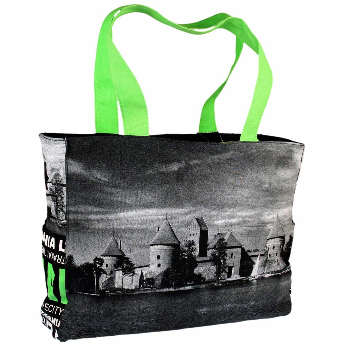 Talpi medvilninė rankinė su Trakų pilies dizainu ir ryškiomis žaliomis detalėmis – praktiškas ir išskirtinis lietuviškas aksesuaras.