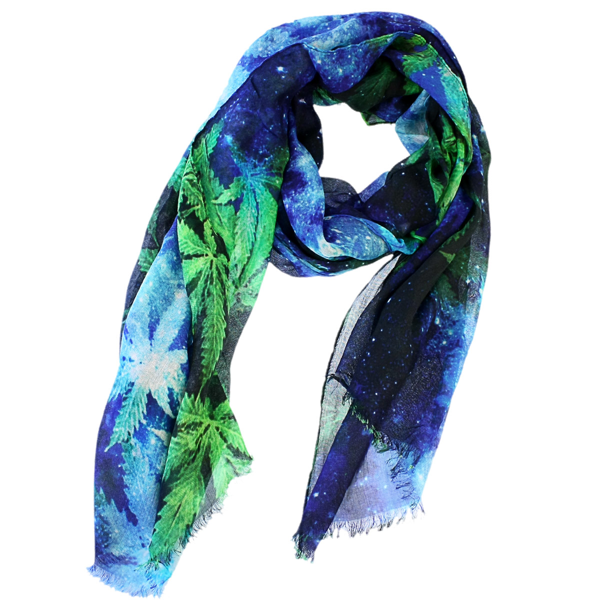 Elegantiškas moteriškas šalikėlis gilių mėlynų ir žalsvų atspalvių su išskirtiniu lapų raštu. Dizainas primena naktinį dangų ir suteikia paslaptingumo bei modernumo kiekvienam įvaizdžiui.