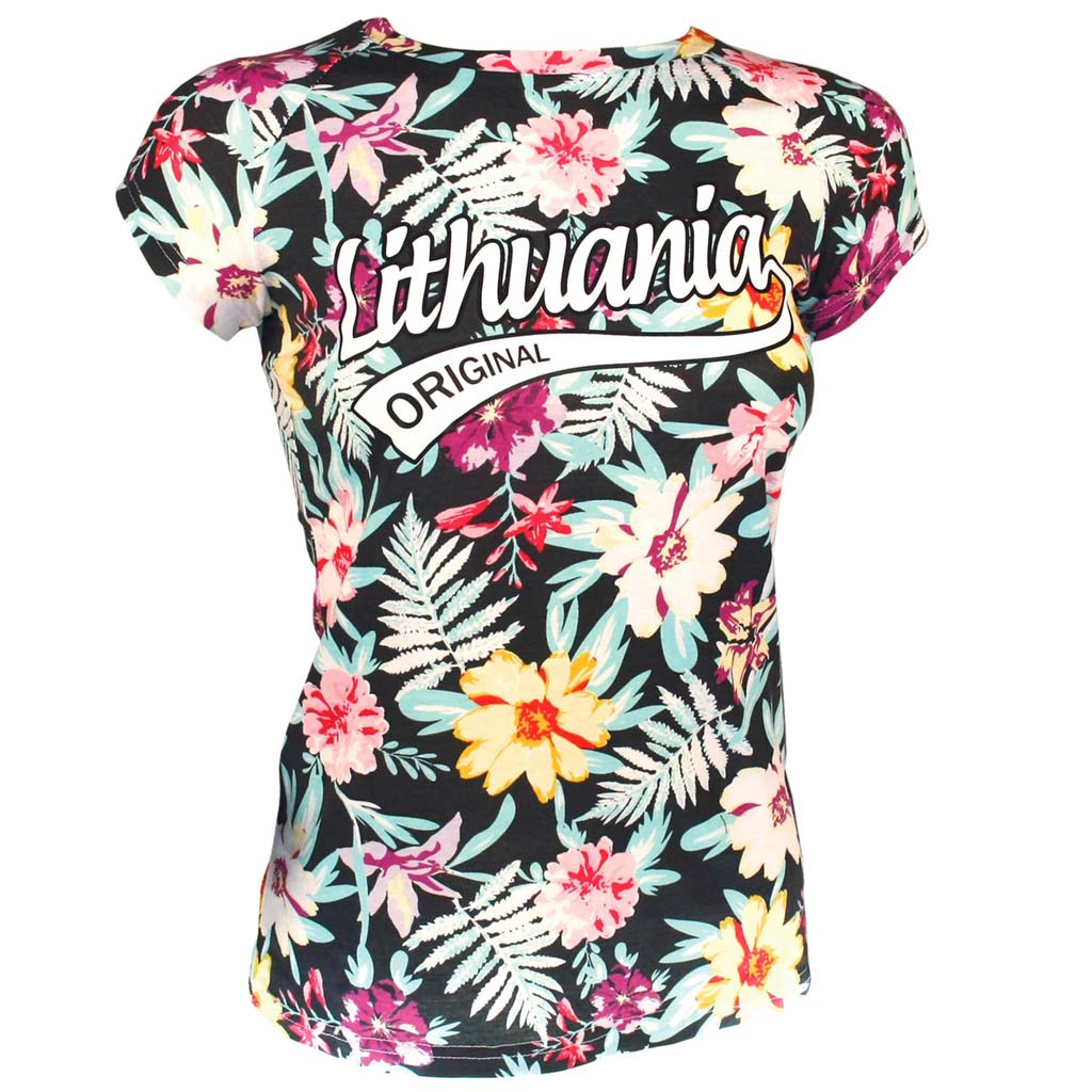 Stilingi moteriški marškinėliai „Lithuania Original“ su tropinių gėlių raštu. Lengvi, patogūs ir modernūs marškinėliai – populiarus Lietuvos suvenyras keliautojams.