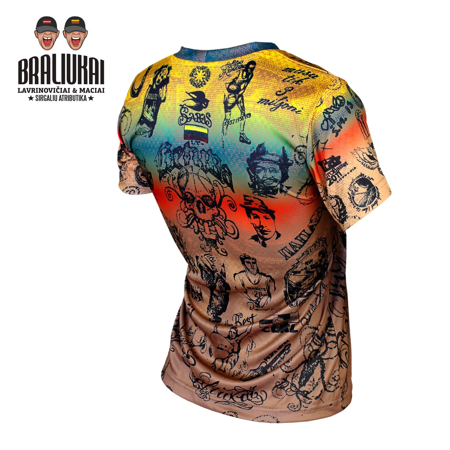 Išskirtinio dizaino moteriški marškinėliai „Tattoo Braliukai“, sukurti aistringoms krepšinio sirgalėms. Tai originali brolių Macių sukurta sirgalių atributika, įkvėpta sporto, gatvės kultūros ir tatuiruočių estetikos.