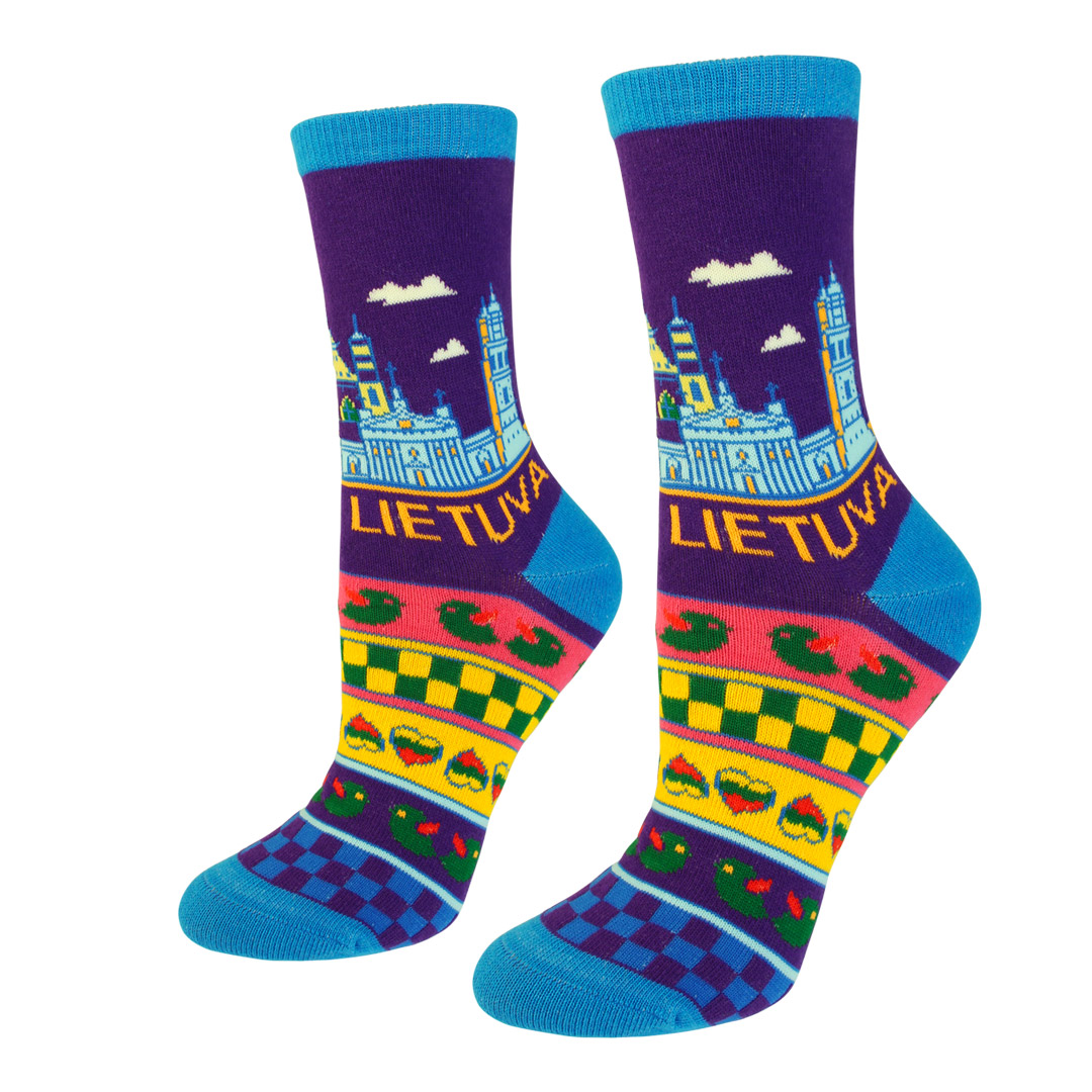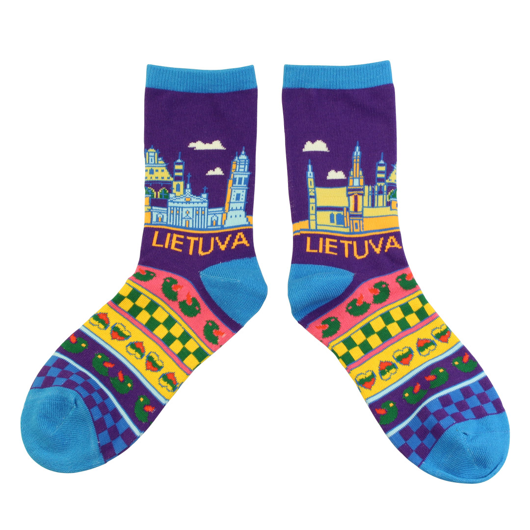 Spalvingos moteriškos kojinės su Vilniaus miesto panorama ir užrašu „Lietuva“. Medvilninės, patogios ir populiarus suvenyras iš Lietuvos.