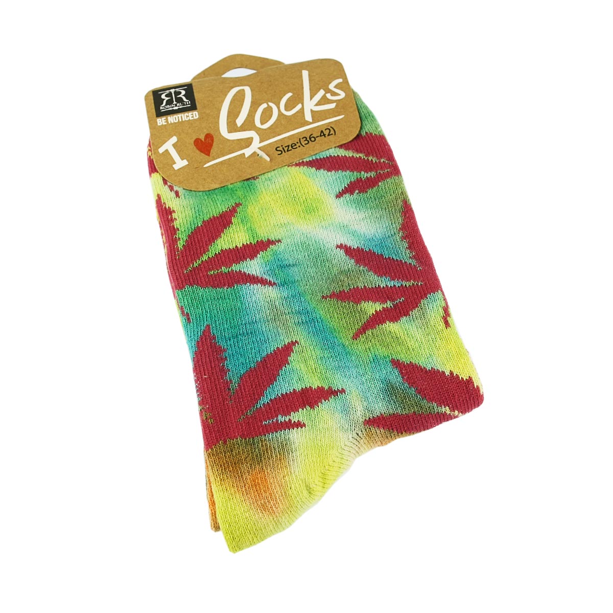 Vaivorykštės spalvų fonas suteikia kojinėms energijos ir žaismingumo, o kontrastingi lapų motyvai sukuria unikalų ir madingą dizainą. Šios kojinės taps akcentu bet kuriame laisvalaikio ar kasdienės aprangos derinyje.