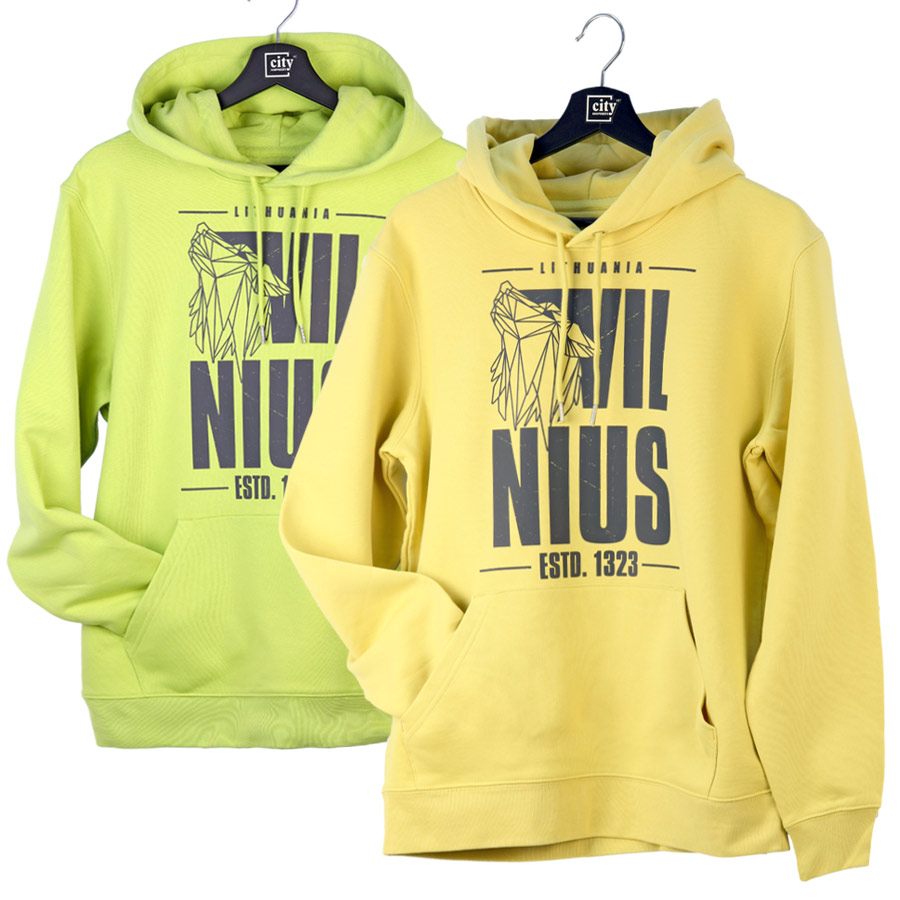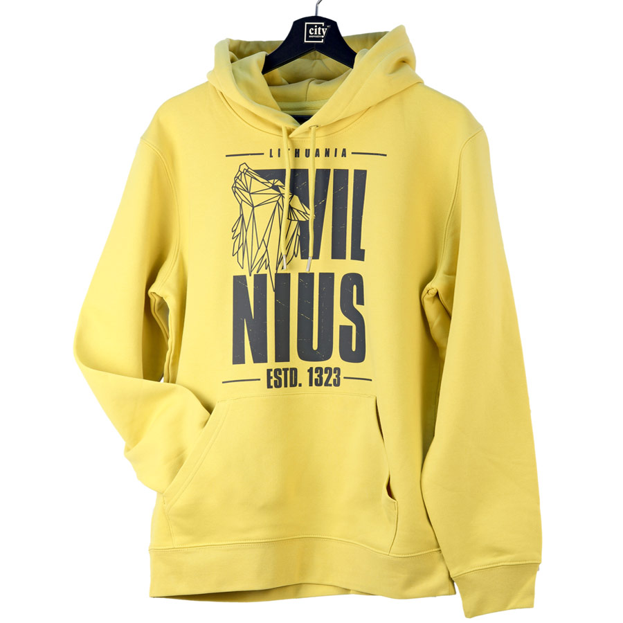 Stilingas gelsvos spalvos džemperis su gobtuvu „Vilnius“, pagamintas iš aukštos kokybės organinės medvilnės, yra patogus ir modernus drabužis su Lietuvos sostinės simbolika. Šis modelis puikiai tinka tiek kasdieniam dėvėjimui, tiek kaip autentiškas suvenyras iš Vilniaus. Džemperis pagamintas iš storo ir minkšto 350 g/m² audinio, kuris suteikia šilumos ir komforto. Audinio sudėtis – 85% organinė medvilnė ir 15% perdirbtas poliesteris, todėl jis yra patvarus, ilgaamžis ir draugiškesnis aplinkai. Priekinėje dalyje pavaizduotas modernus Vilniaus dizainas su stilizuotu Geležinio Vilko motyvu ir užrašu „Vilnius – ESTD. 1323“, simbolizuojantis miesto istoriją ir legendą apie Vilniaus įkūrimą. Džemperis turi patogų kapišoną su reguliuojamais raišteliais, talpią kengūros tipo priekinę kišenę ir elastinius rankogalius bei apačią. Tai universalus unisex modelis, tinkantis tiek vyrams, tiek moterims. Puikus pasirinkimas suvenyrų parduotuvėms, muziejams, turizmo centrams ir oro uostų parduotuvėms, kur turistai ieško kokybiškų Vilniaus atributikos drabužių.