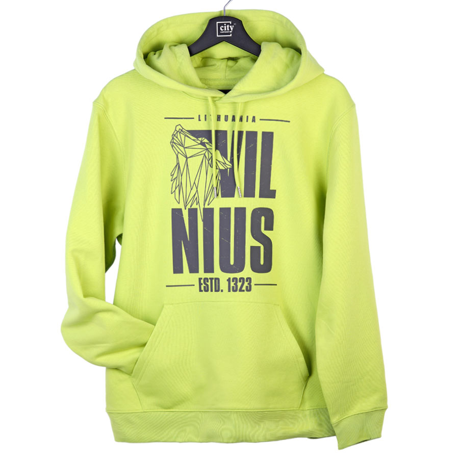 Žalsvos spalvos džemperis su kapišonu „Vilnius“, pagamintas iš 85% organinės medvilnės ir 15% perdirbto poliesterio, 350 g/m² audinio.