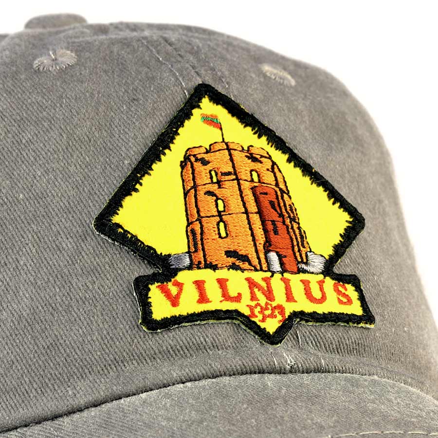 Pilka „vintage“ kepurė su Vilniaus simbolika – Gedimino pilies bokštu.